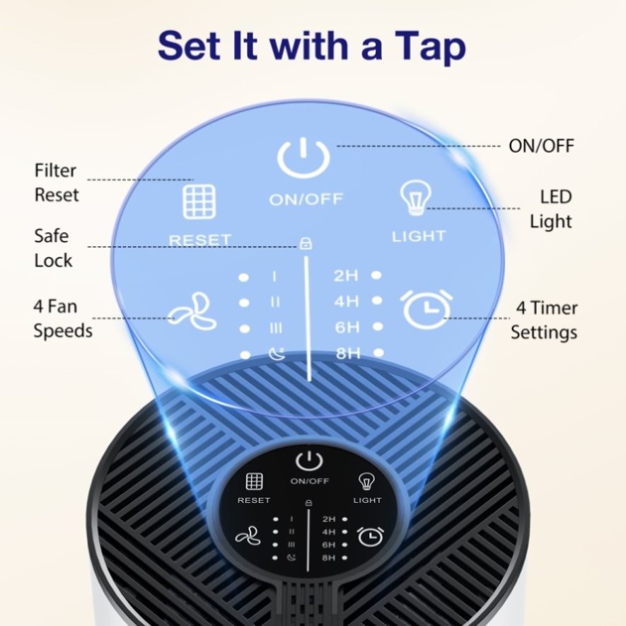 - Compact, Convenient & Energy-Smart: With a space-saving design (150150200mm) and lightweight build (695g net, 865g gross), it fits perfectly in bedrooms, offices, or studies. Use the 2/4/6/8-hour timer to match your schedule, power it easily with a 5V, 1A adapter, and enjoy hassle-free maintenance with a 1440h (±10%) filter lifespan – simple, efficient, and energy-friendly.