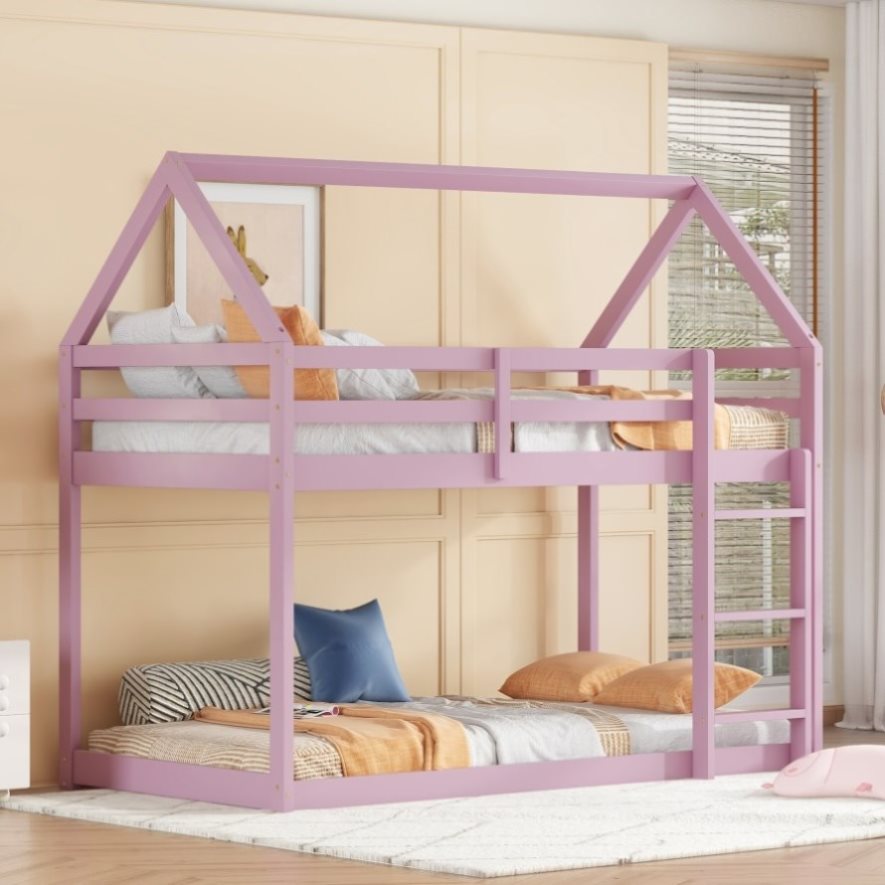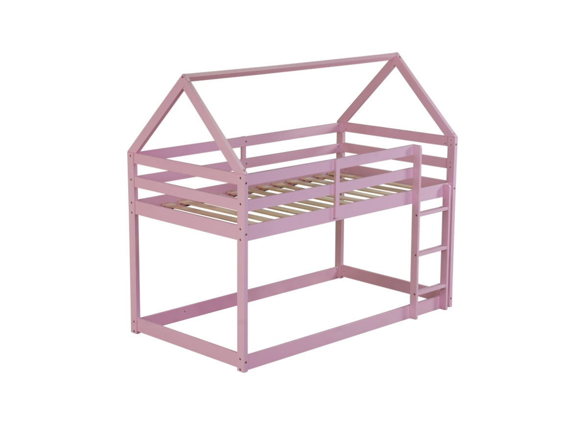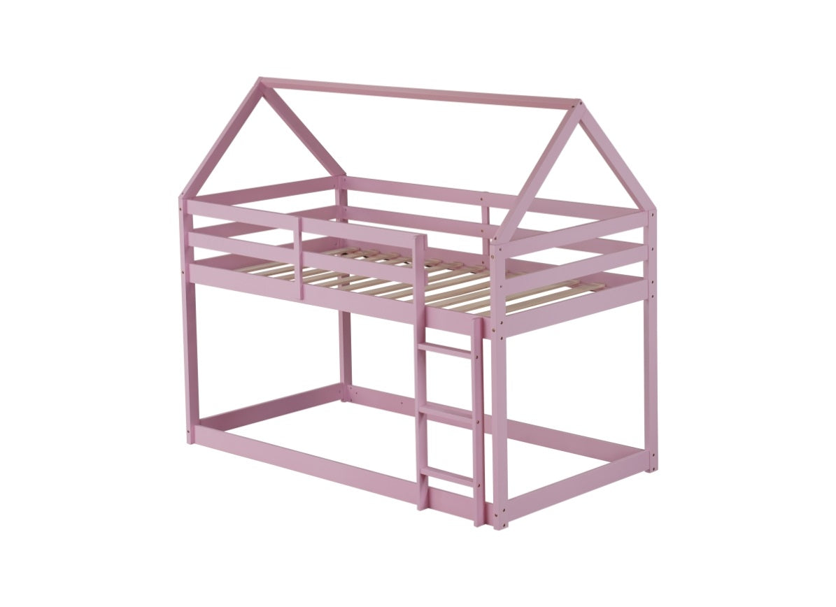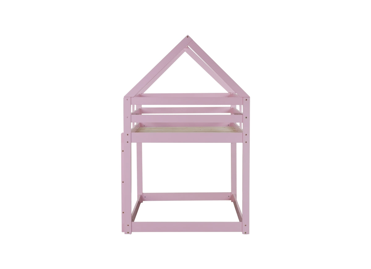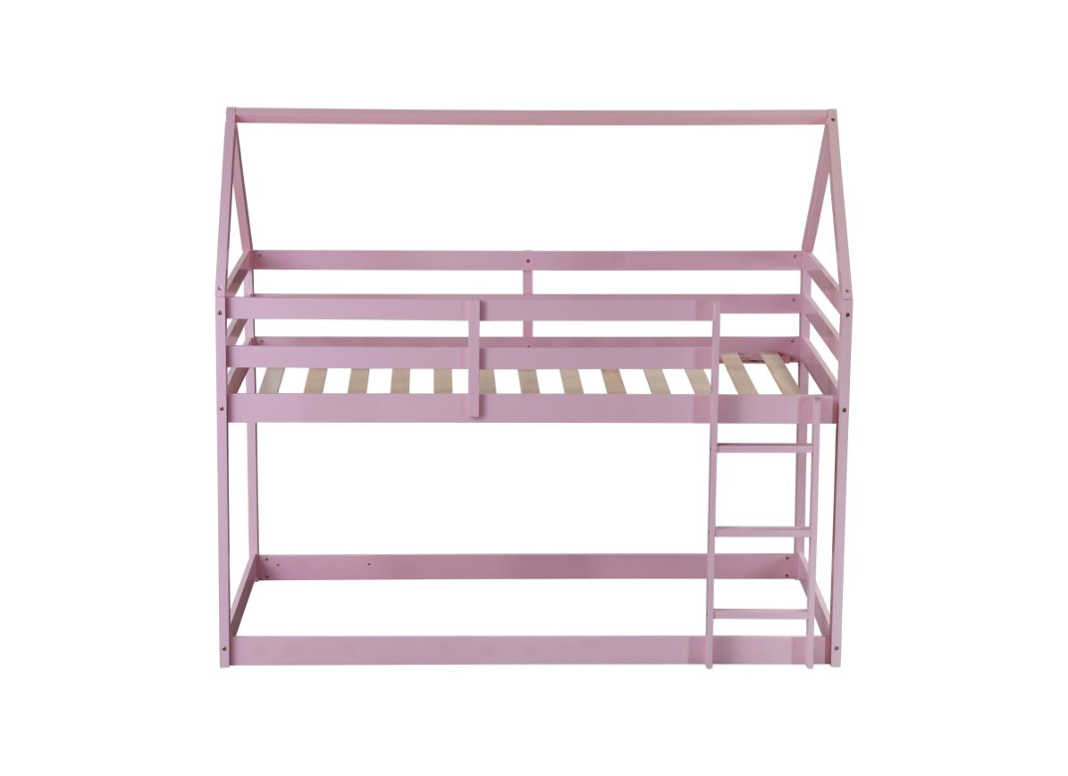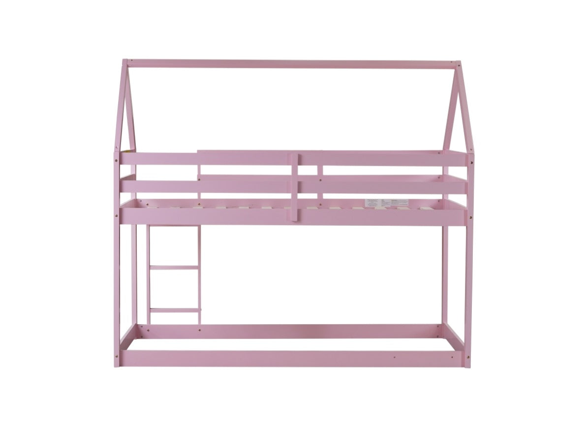 Twin over Twin Rubber Wood Floor Bunk Bed, with ladder,Guardrails,House-Shaped-Bunk Bed,Pink W504P206867