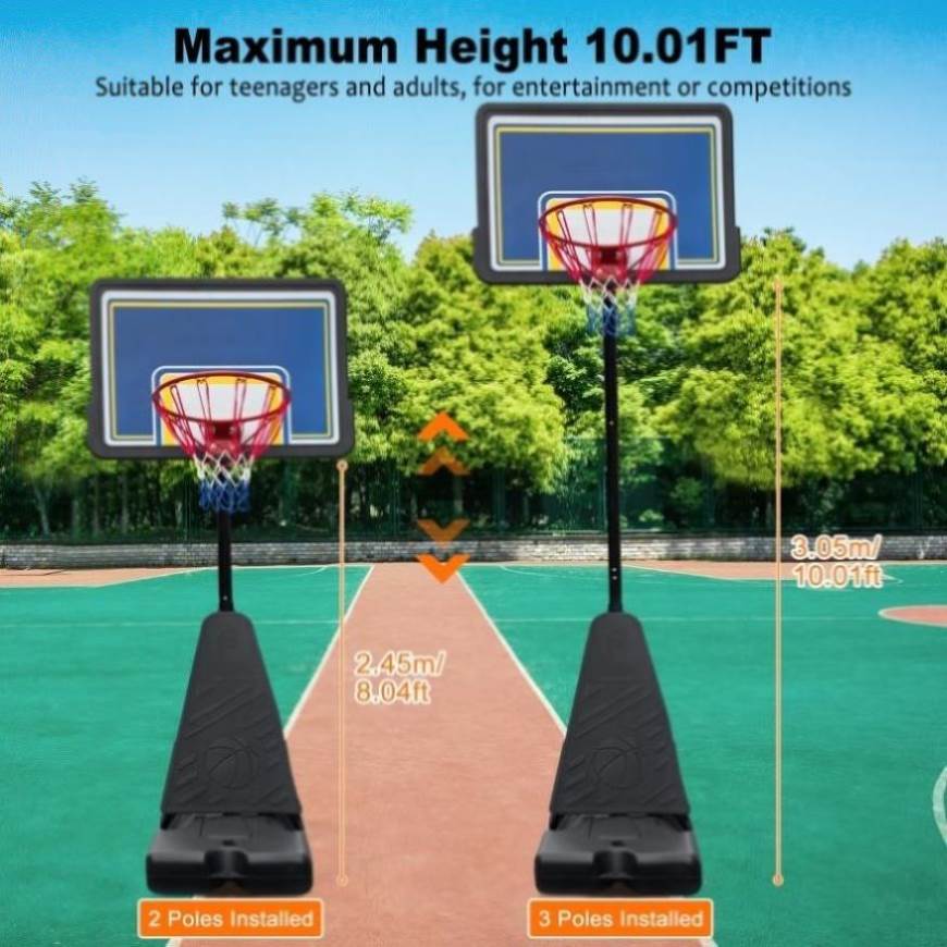 Height-adjustable basketball hoop: The height of the basketball hoop can be adjusted from 8.04 ft to 10.01 ft, suitable for teenagers and adults to practice basketball