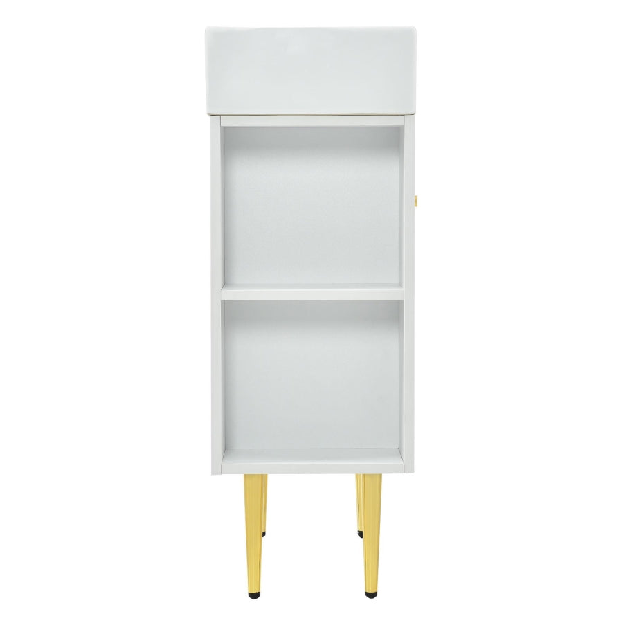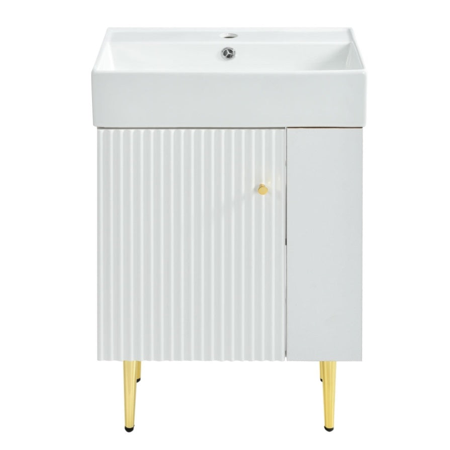 From its rectangle Ceramic top to its contemporary style hand-painted cabinet door, this single bathroom vanity is sure to brighten up your bathroom. Crafted from solid and MDF, this piece features a Ceramic top for a modern look and a clean-lined silhouette. A rectangle under-mount sink gives you a convenient place to wash your hands, while a single-door cabinet with shelf stores all your bathroom essentials. And there is a Side storage cabinet for you to place toilet paper and other supplies.In addition, the elegant golden handles, tapered legs make this bathroom vanity achieve the perfect balance of form and function.