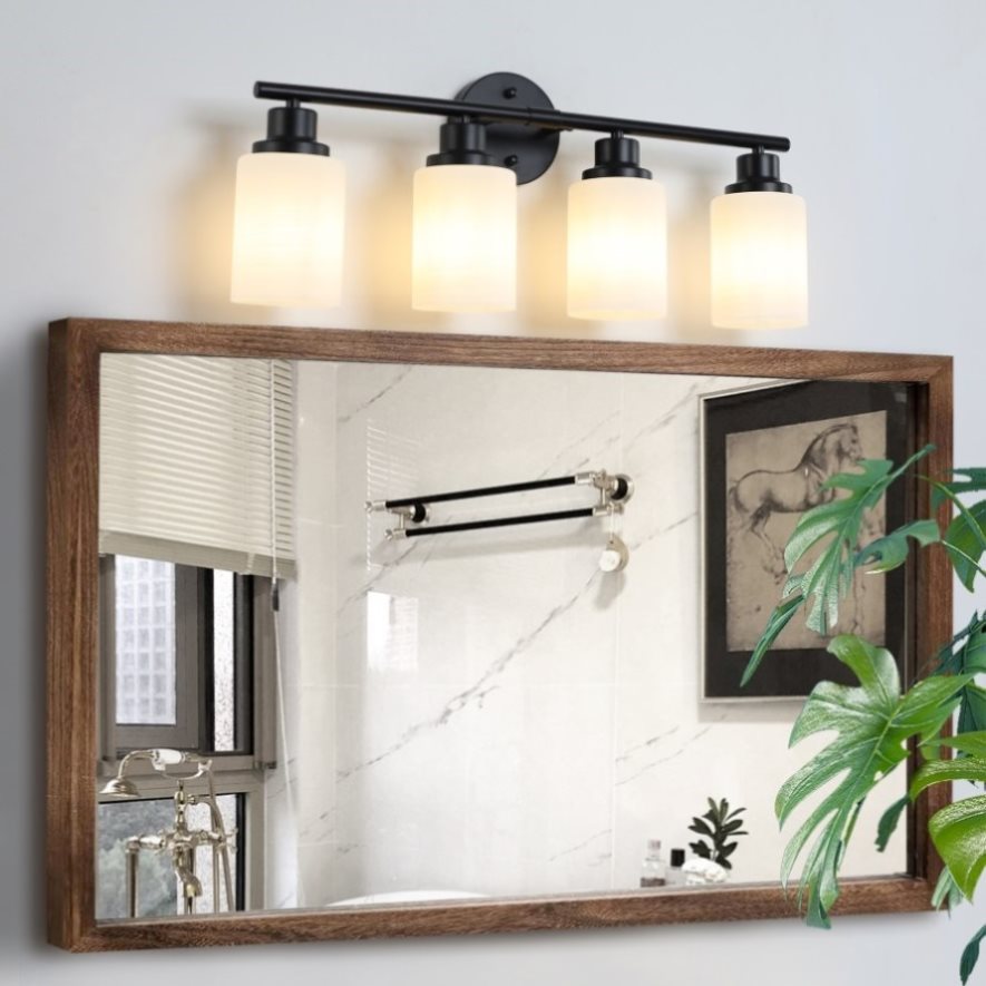 Modern 4-Light Vanity Bathroom Mirror Light, Frosted White Glass with Black Iron Frame
