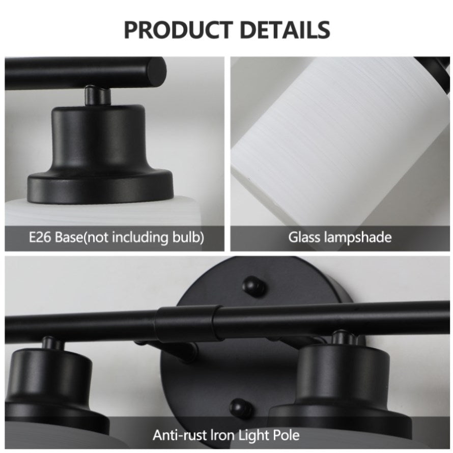This 4-light mirror headlight features a simple yet stylish design that combines white frosted glass and a black iron frame for an elegant yet modern look. High quality materials guarantee the durability of the product, and soft lighting brings a warm atmosphere to your bathroom, bedroom or powder room. Versatility makes it ideal not only for bathrooms, but also for Spaces that require good lighting, such as powder rooms and bedrooms. Easy to install, even for non-professionals. Compatible with LED bulbs(bulb not included), energy saving and environmental protection, for you to save electricity at the same time, reduce the trouble of frequent bulb replacement, is your home decoration and lighting perfect choice.