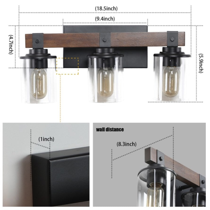Farmhouse bathroom vanity light is made of metal and handmade wood grain carved on real wood, wood style finish and clear glass, Rustic bathroom light fixtures, has a vintage and rustic design style that adds elegance and nature to your home. Farmhouse vanity lights for bathroom, a combination of black and wood design brings modernity and farmhouse style, which shows a simple and pure atmosphere and perfectly suits for your home decoration.Durable Quality Construction: Thick tempered glass lampshade with sturdy alloy metal resists oxidation and fading, farmhouse vanity light could be used in a wet location, more durable and safer.Dimensions Ideal for Any Place:Farmhouse bathroom vanity lights size 18.5"L x8.3"W* 5.9"H. E26 Heat-Resistance Base:Rustic farmhouse vanity light compatible with any E26 base bulb (Incandescent,CFL,halogen,LED bulbs suitable,Max 60W for each bulb,Not included).