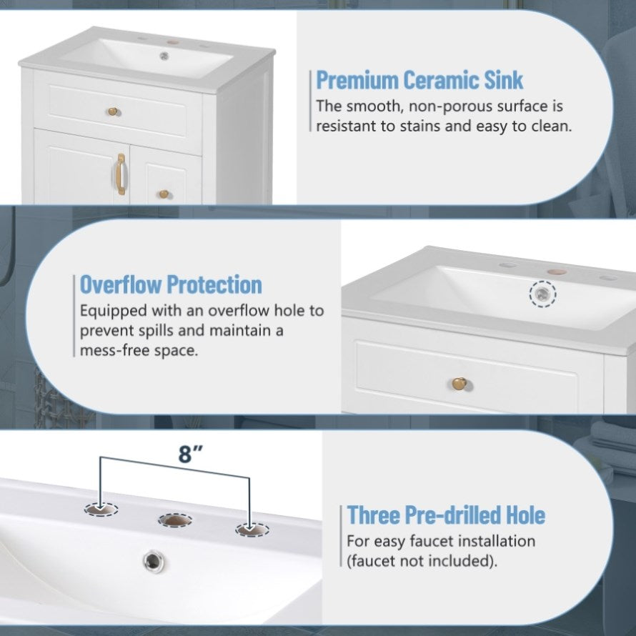 Transform your bathroom with our 24-inch white vanity, a perfect fusion of elegance and practicality. Imagine the smooth, easy-to-clean ceramic sink, accented by the gleam of golden vintage metal handles. The soft-close drawers glide open with a whisper, revealing generous storage for all your essentials. Double racks on the door keep your space organized and tidy, elevating your daily routine.Crafted with durable wood and MDF, this vanity is built to last, while its graceful lines and golden handles add a touch of luxury.