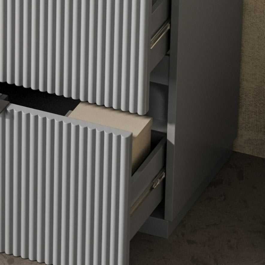 This bathroom vanity features vertical grooves or ridges on its surface, creating a timeless, tactile texture that elevates ordinary cabinetry into a statement piece.