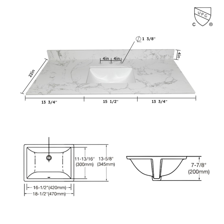 [PACKAGE INCLUDED] Vanity top with assembled rectangular under mount bowl matching 4inch high Backsplash Besides extremely solid package - very firm carton box with foam is used to transport top making sure a safe delivery (Attention) Faucet and side splash NOT included