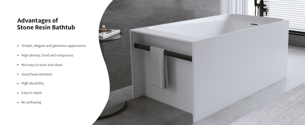 Stone resin material: The free stand bathtub is composed of a sturdy surface, with years of durability and strength. Hard, tough, wear-resistant, non permeable, slow heat dissipation, no obvious cold sensation, and does not change color for a long time.