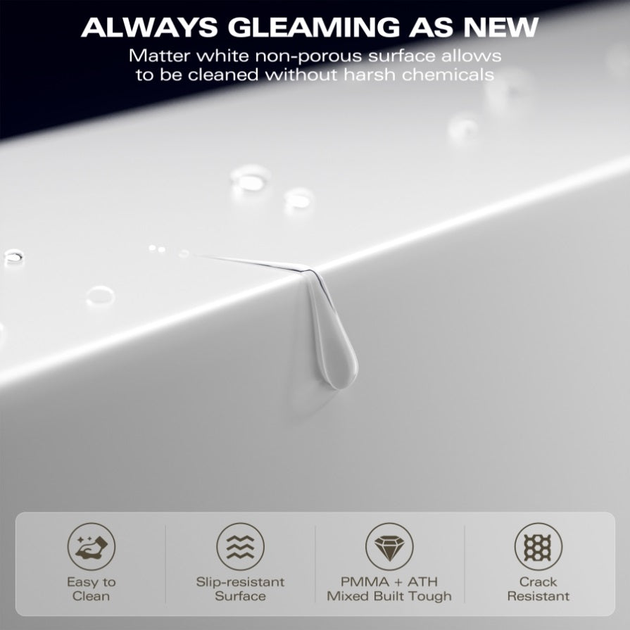 Effortless Maintenance & Hygiene: Manufactured using a sophisticated combination of PMMA resin and ATH aluminum powder, this polished man-made stone bathtub is engineered to resist stains and minimize maintenance and won't crack, flake, detach, or turn yellow over time. The non-porous, antibacterial surface simplifies cleaning and can be repaired by sanding paper to even out scratches and obtain an absolutely smooth finish.