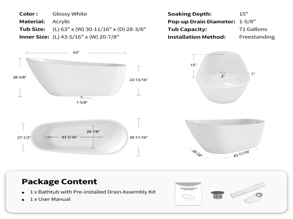 63" Acrylic Freestanding Bathtub, Stylish Deep Soaking Bathtub with Pop-up Drain & Integrated W1920P386220