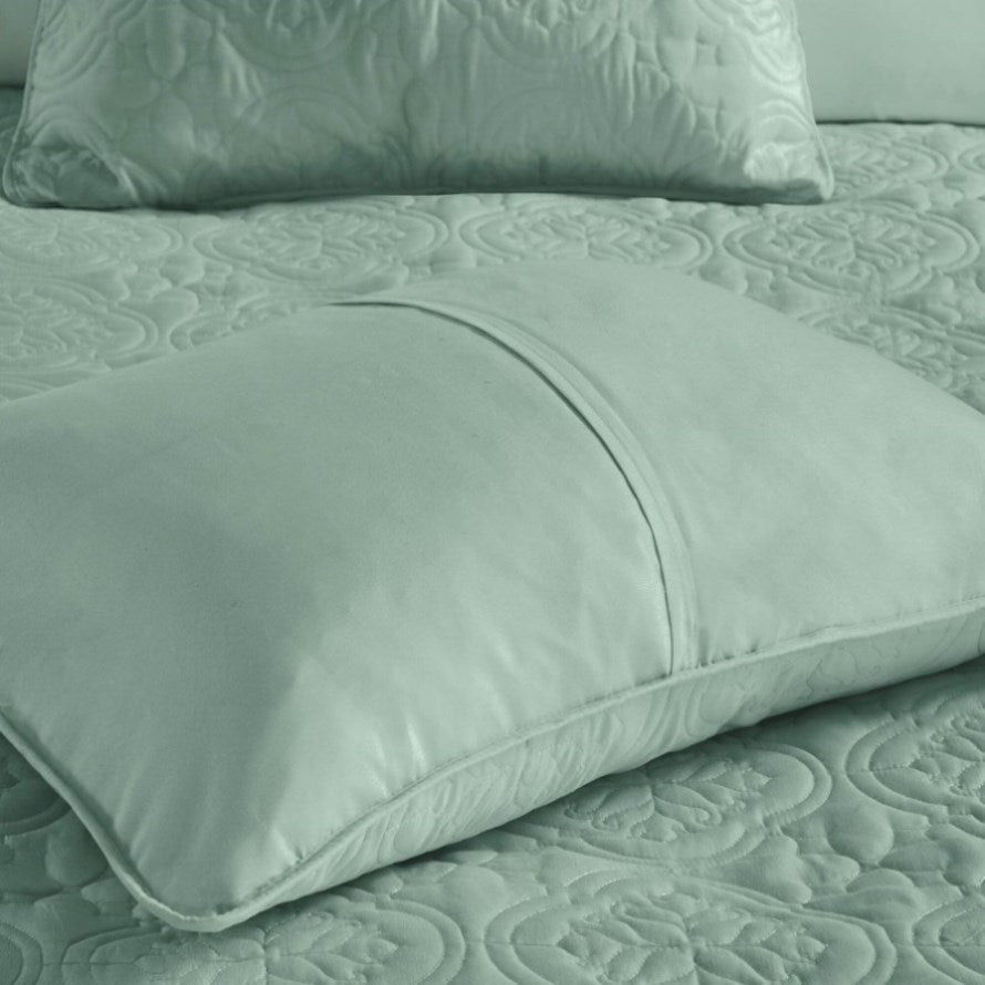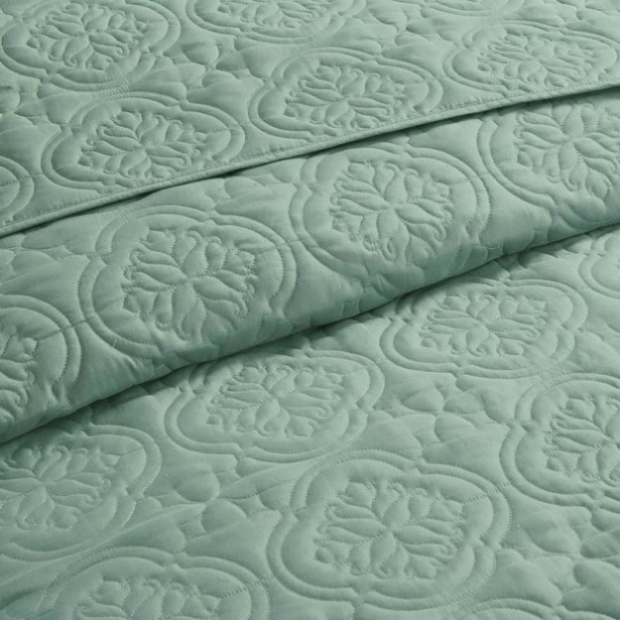 The 510 Design Oakley 3 Piece Reversible Bedspread Set offers a simple and stylish addition to your bedroom décor. A quilted medallion technique is displayed on the seafoam bedspread and shams, adding dimension and charm to the top of the bed. Unlike traditional coverlets or quilts, this bedspread is oversized to drape better and features 100% hypoallergenic polyester filling. Made from ultra-soft microfiber, this oversized cover up is machine washable for easy care and adds a chic transitional allure to your bedroom.