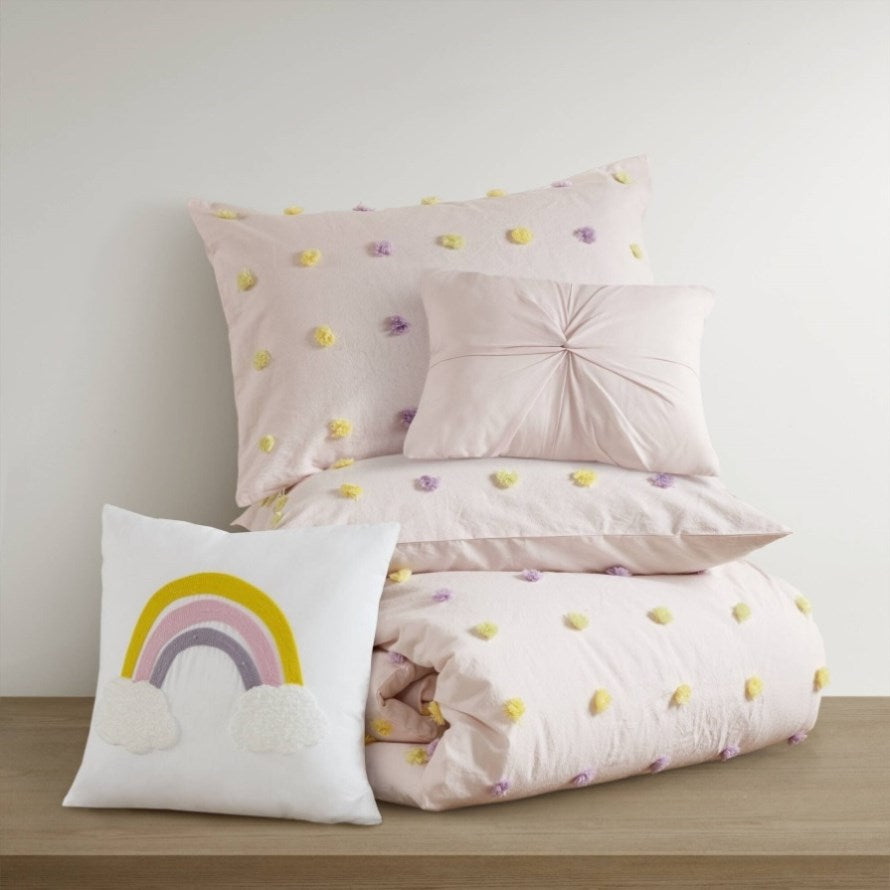 Set includes comforter, two matching shams (1 in Twin/TwinXL) and two decorative pillowsDecorative pillow in 16x16 features embroidered rainbow and cloud to match the clip cots on the comforterDecorative pillow in 12x16 features fabric manipulated ruchingComforter and decorative pillows have polyester hypoallergenic fillingOeko-Tex Certified, includes no harmful substances or chemicals...