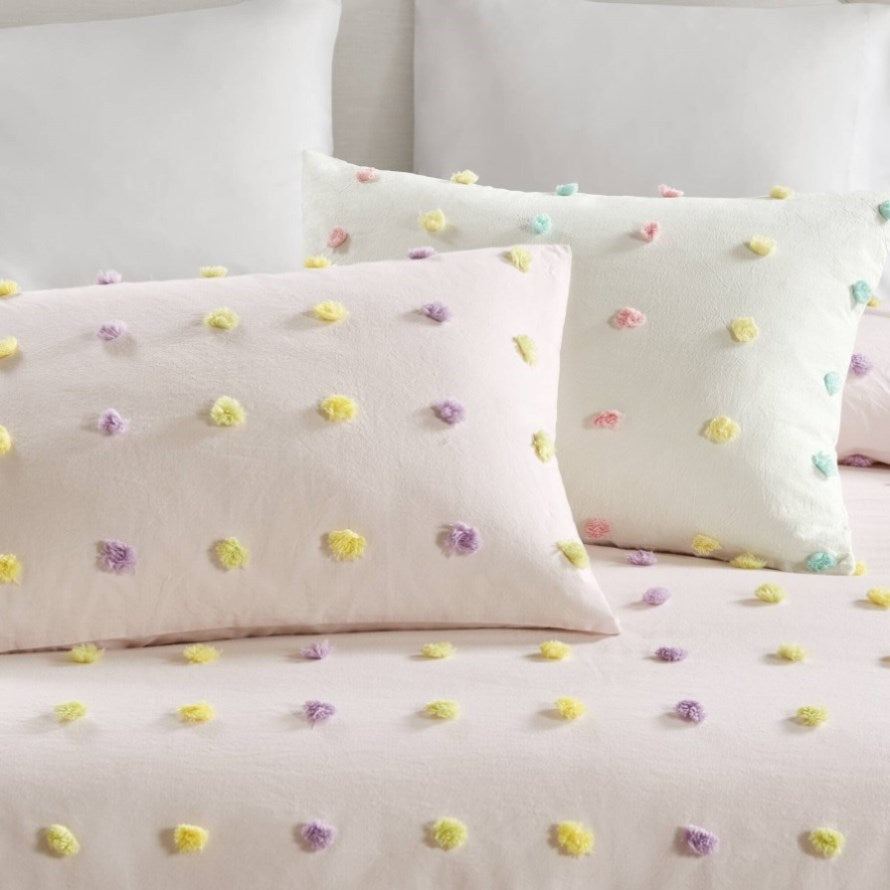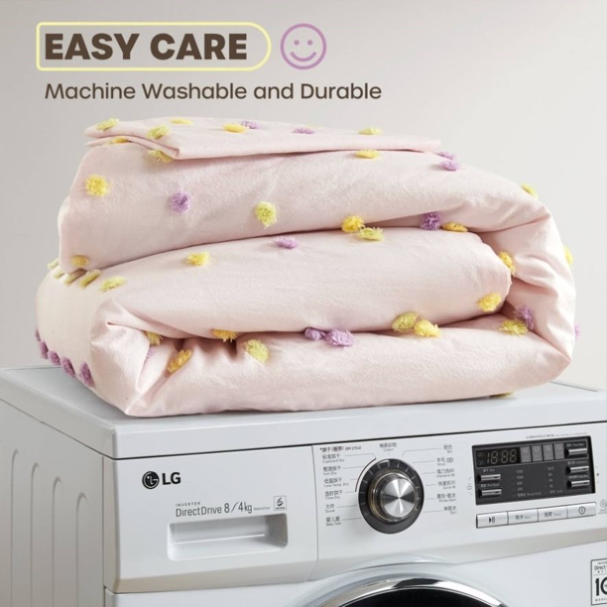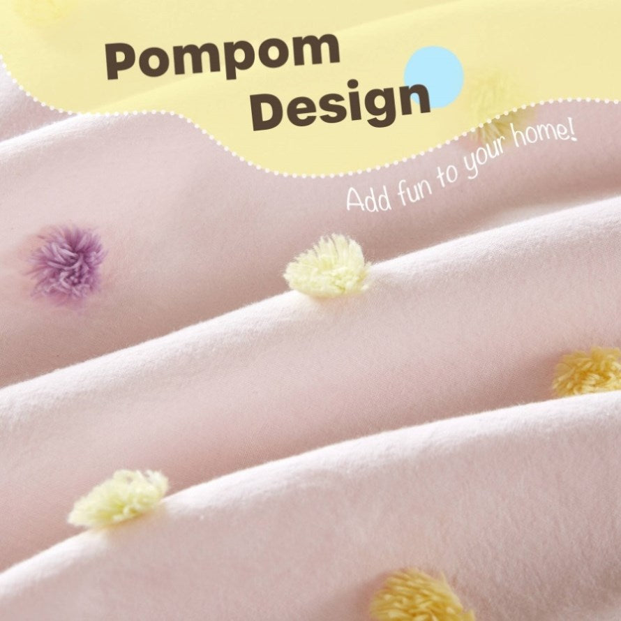 COMFORTER/SHAM Face:100% cotton Y/D with multi color pompom Rev: T144 cotton solid reverse Comforter Filling: 220gsm poly Quilting: Hidden quilt DEC: Face & Rev: 100% cotton Filling: 350g/270g PP