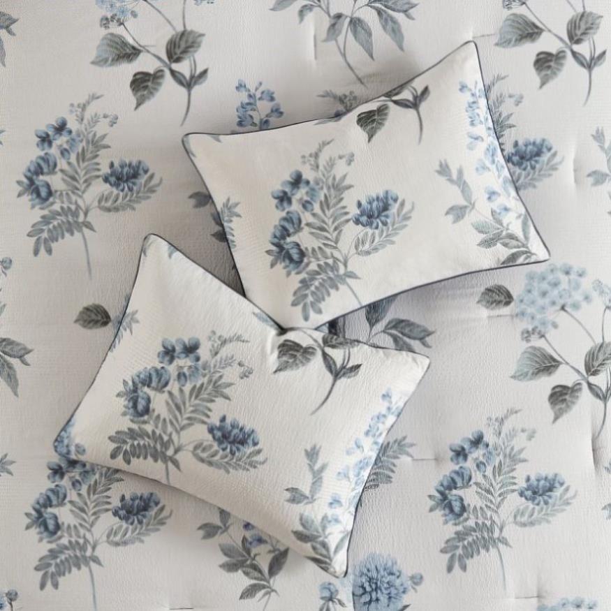 The Madison Park Zennia 7 Piece Printed Seersucker Comforter Set with Throw Blanket offers a charming farmhouse update for your bedroom. The textured seersucker comforter features an all-over floral print in soft blue and green hues on the white base, for a cottage-inspired look. A solid blue hue on the reverse complements the top of the bed with a fresh splash of color. Two shams mirror the top of the bed, while two blue Euro shams complement the reverse of the comforter. An oblong decorative pillow with ruched details adds a rich textural finish to the floral comforter set. Also included is a bonus throw blanket that measures 50”x60”. Hypoallergenic filling in the comforter and decorative pillow provide exceptional warmth and comfort. Machine washable for easy care, this seersucker comforter set brings a serene beauty to your bedroom decor. Items in the set may come in a rolled or compressed packaging, which will need to be fluffed up or steam ironed before use to remove wrinkles.