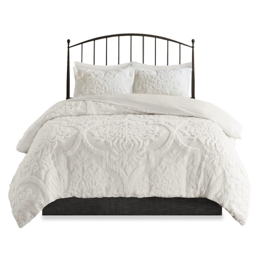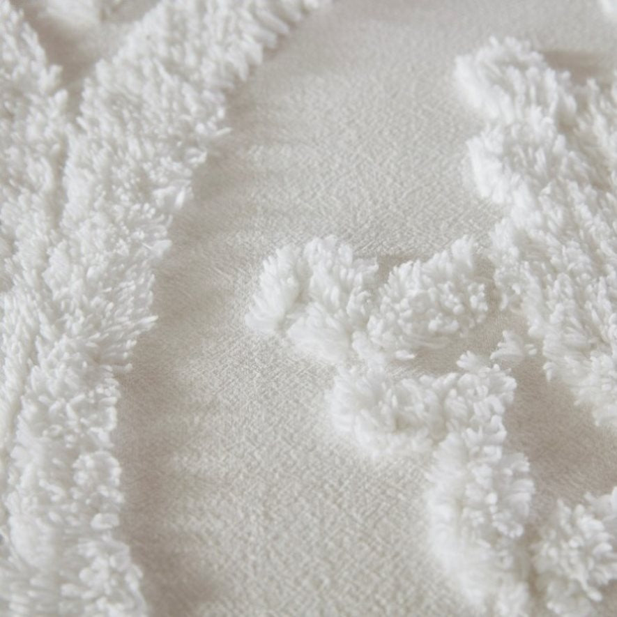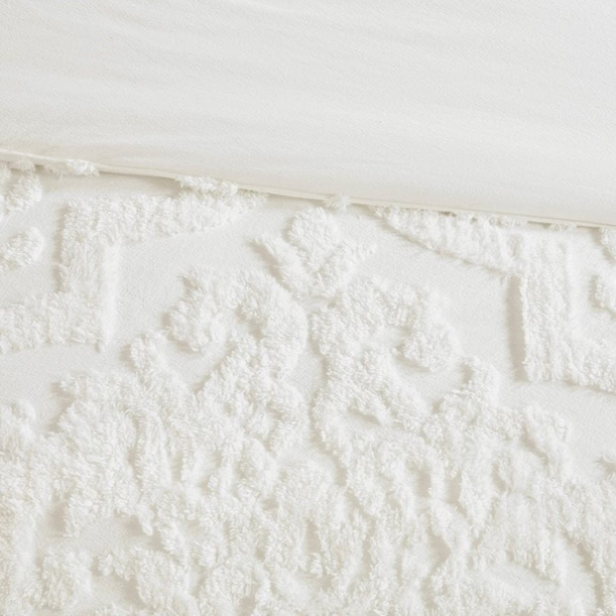 The Viola 3 Piece Tufted Cotton Chenille Damask Duvet Cover Set offers the perfect cottage touch to your bedroom décor. A tufted chenille damask design is beautifully displayed on the 100% cotton duvet cover and matching shams, for a soft shabby chic look. Machine washable for easy care, this bedding set is OEKO-TEX certified, meaning it does not contain any harmful substances or chemicals to ensure quality comfort and wellness. A button closure secures a comforter insert within the duvet cover and inside corner ties prevent it from shifting (insert is NOT included). Due to the nature of the chenille fabric, some shedding will occur naturally in the first 3-4 washes.