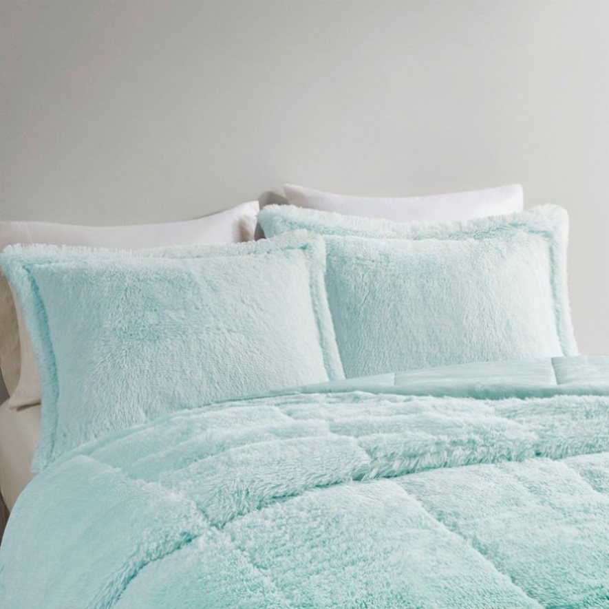 Comforter/Sham: 100% polyester shaggy long fur to solid plush, 100% polyester filling, jump tack quilting, knife edge