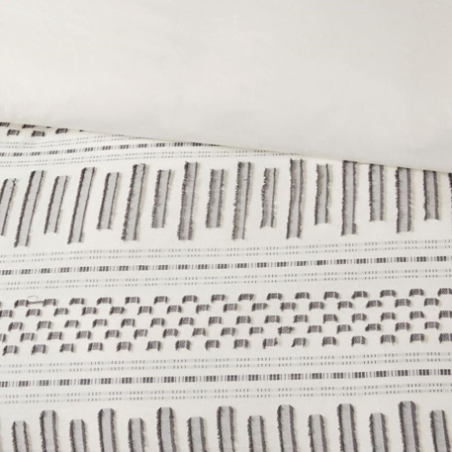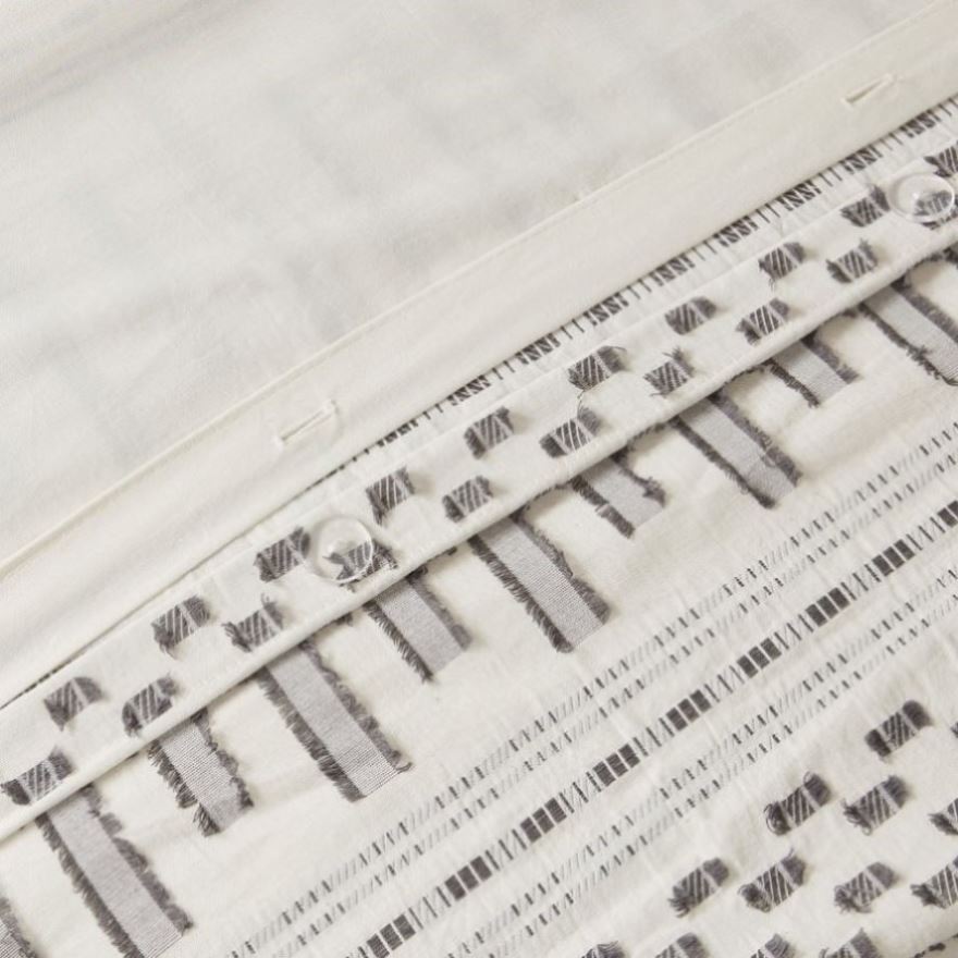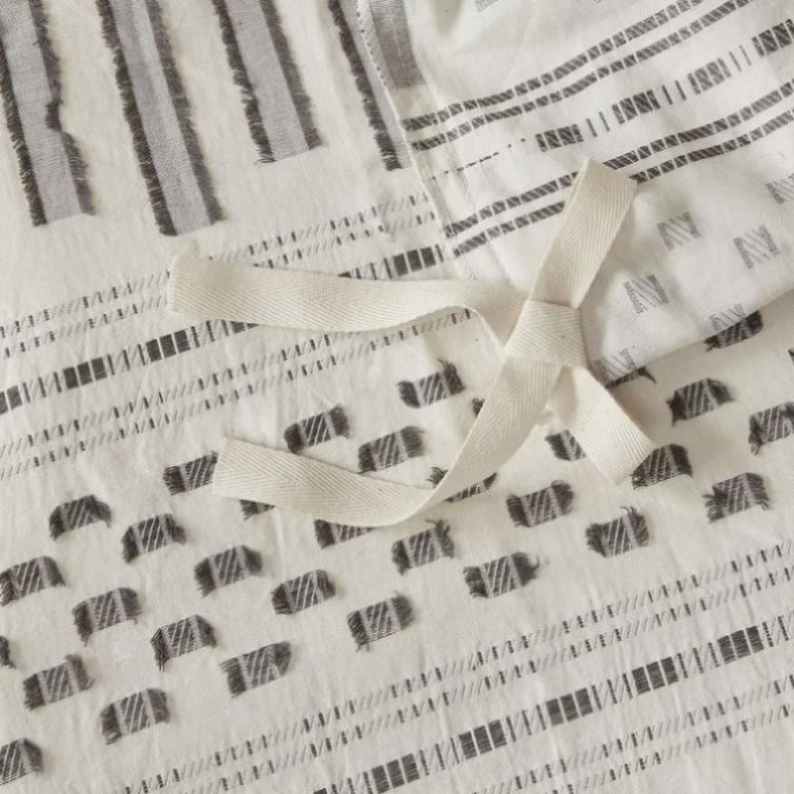 Give your bedroom a comfortable farmhouse look with INK+IVY’s Rhea Cotton Jacquard Duvet Cover Mini Set. The ivory cotton duvet cover features horizontal stripes, in charcoal hues, with eyelash-looking woven details that add a charming accent to the top of the bed. Matching shams mimic the design seen on top of the bed completing the cotton jacquard bedding set. Made from 100% cotton, this jacquard duvet cover set is machine washable for easy care and provides a causal allure for your bedroom décor. A button closure allow you to place a comforter insert within the duvet cover and four inside ties on the corners help prevent it from shifting (Insert is NOT included). This bedding set is also OEKO-TEX certified, meaning it does not contain any harmful substances or chemicals, ensuring quality comfort and wellness. Items in the set may come in a rolled or compressed packaging, which will need to be fluffed up or steam ironed before use to remove wrinkles.