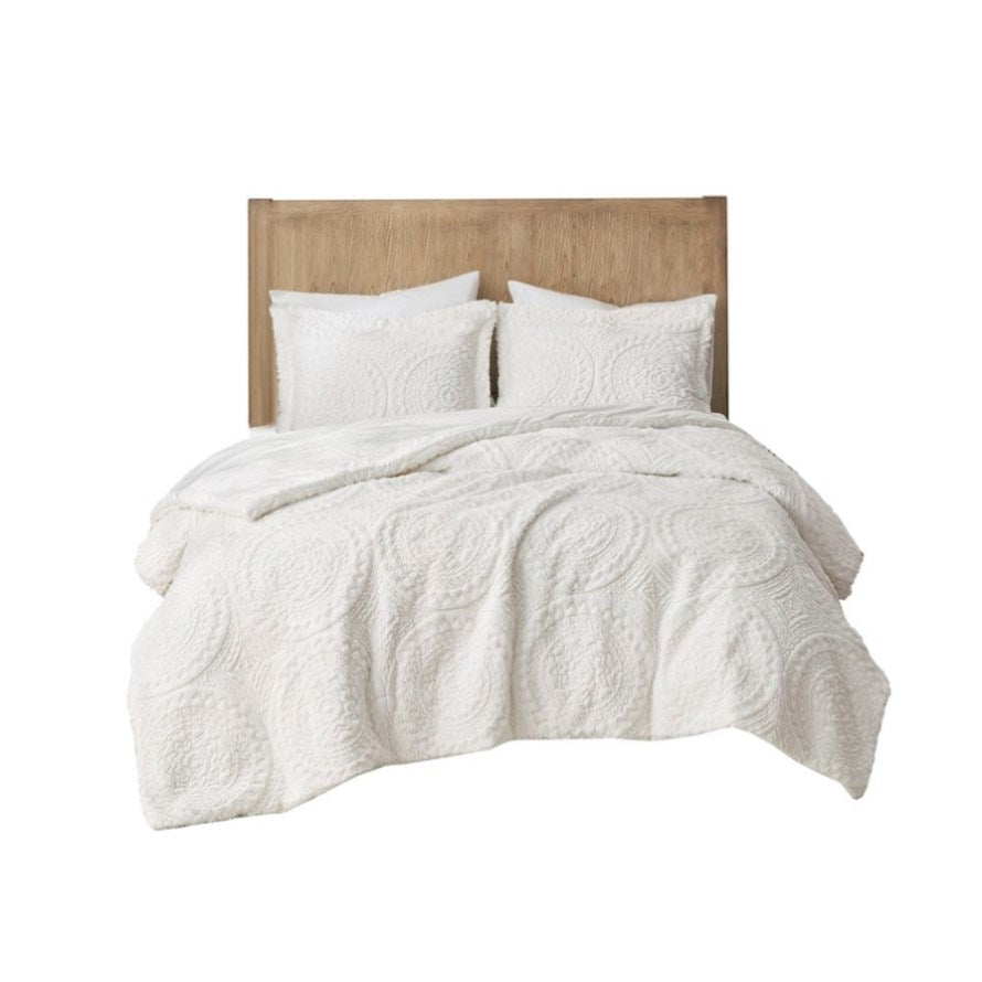Faux fur comforter features an embroidered medallion patternReverse is a soft faux minkHypoallergenic fill for comfort and wellnessSet includes comforter and two matching shams (1 in Twin)Machine wash separately in large capacity washer with cold water on gentle cycle, do not use fabric softener or bleachTumble dry separately in large...