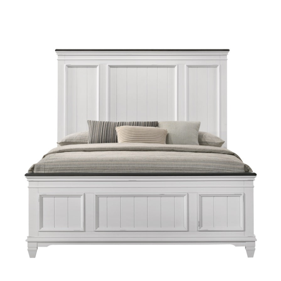 Contemporary shiplap detailing and a weathered white finish mean this Clelane Wood Bedroom Set will give your bedroom a fresh new look. A stylish bed, this one is made of solid tropical wood and laminate with Okumin veneers in a charming weathered white finish. Chic shiplap panels inside carved details with trim molding on the headboard and footboard. The distressed mark, delicately carved trim, and black finished hardware brings a touch of modern farmhouse style to this set. English dovetail drawer construction with full extension metal ball bearing drawer glide.