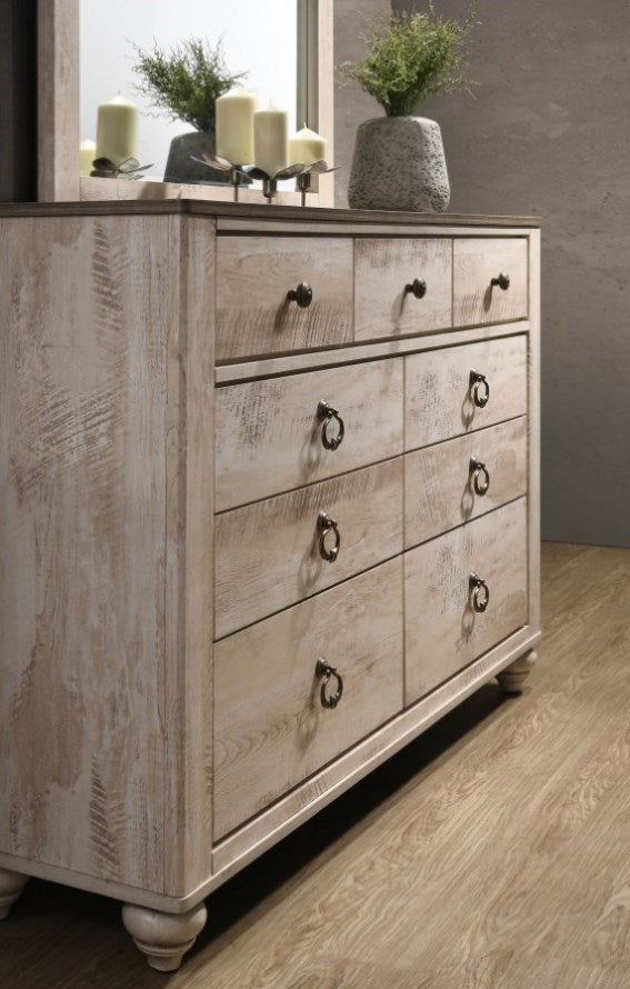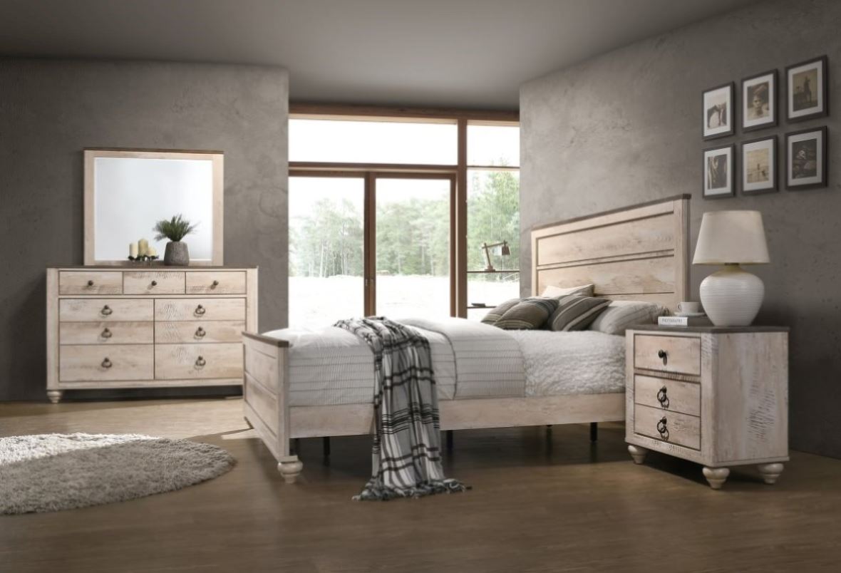 Set including queen bed, dresser, mirror, and nightstandFeatures a paneled headboard accented with antique walnut top trim for an eye-popping look.Rustic, urban chic style bedroom set with white wash finish.Delicate metal ring and nob handles.Turned bun feet and classic molding add an elegant touch.Cases feature English dove-tail constructed spacious drawers...