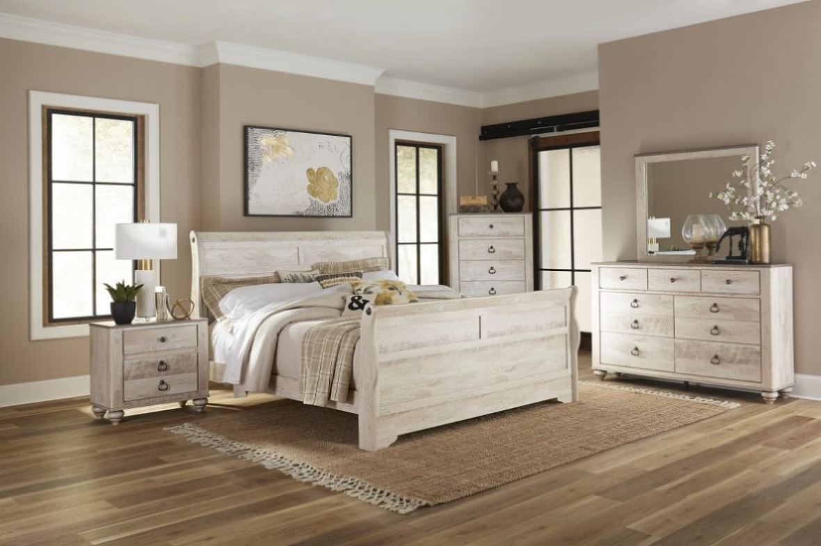 Set including queen bed, dresser, mirror, nightstand and chestThe bed features a sleigh-style headboardRustic, urban chic style bedroom set with white wash finish.Delicate metal ring and nob handles.Turned bun feet and classic molding add an elegant touch.Cases feature English dove-tail constructed spacious drawers with smooth-gliding drawer slides.The top of the...