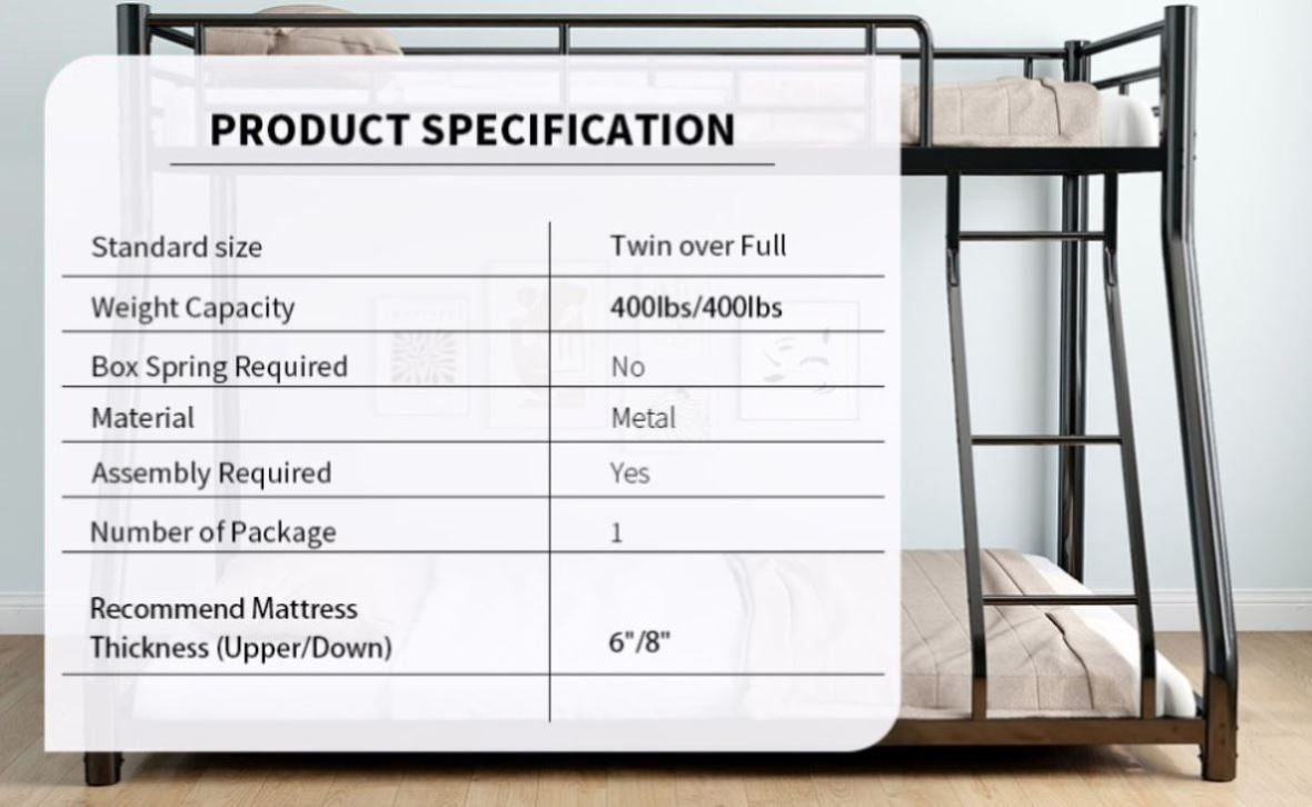 Bunk Bed: This bunk bed is designed with a twin size bed on the top and a full size bed on the bottom, providing comfortable sleeping space for two peopleSolid Construction: This bunk bed is made of strong and sturdy metal provides longevity and stability. There are supporting leg in...