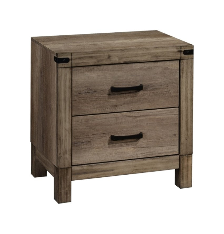 Contemporary Rustic StyleMelamine FinishTwo Drawers NightstandSolid Metal Bar HardwareKenlin drawer glides - smooth and durableDust proof bottoms on case piecesStrong Construction for Everyday Use Product Details: Product Dimensions:- Nightstand:-23.8" X 16" X 25"H Product Description:-The sleek tall nightstand has a light grey finish, a clean frame, and flat drawer panels....
