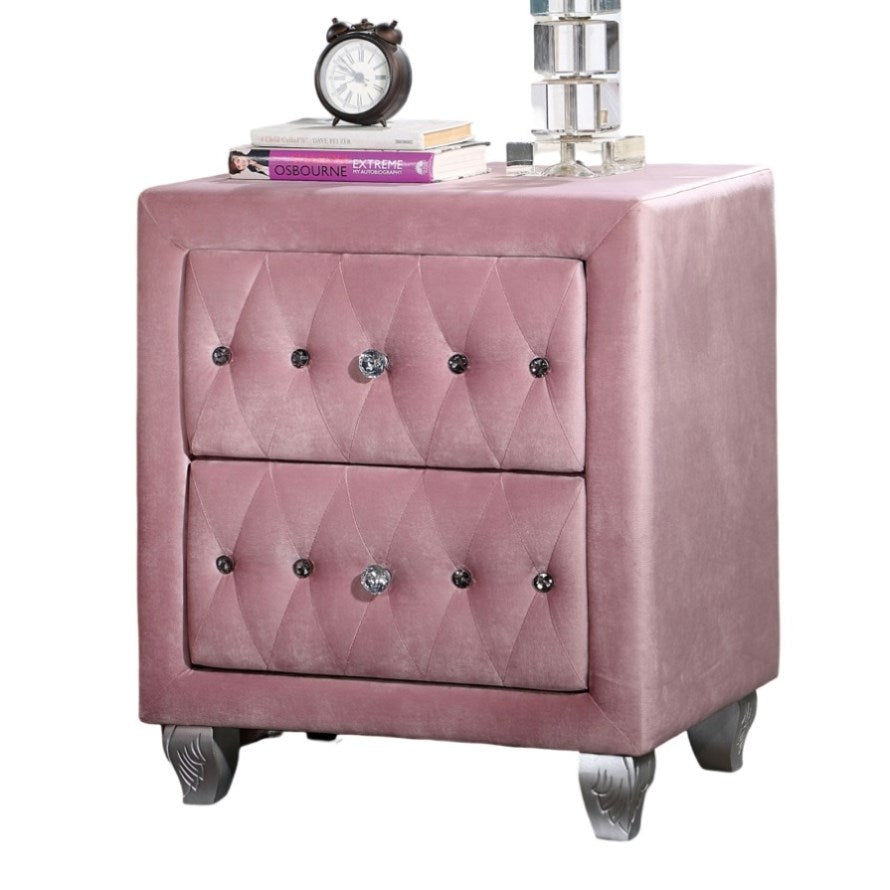 Glam StylePink ColorCabriole LegsCrystal-Like Acrylic Buttons2- Drawers NightstandCrystal-like Acrylic KnobFully UpholsteredBedroom FurnitureVelvet-like, Solid Wood, OthersListing Includes :- 1x Nightstand Only. Product Description Product Description:-Showcase your personal taste with this bold statement piece in your bedroom. Fully upholstered in flannelette, this night stand features eye-catching tufting. The padded fabric and crystal...