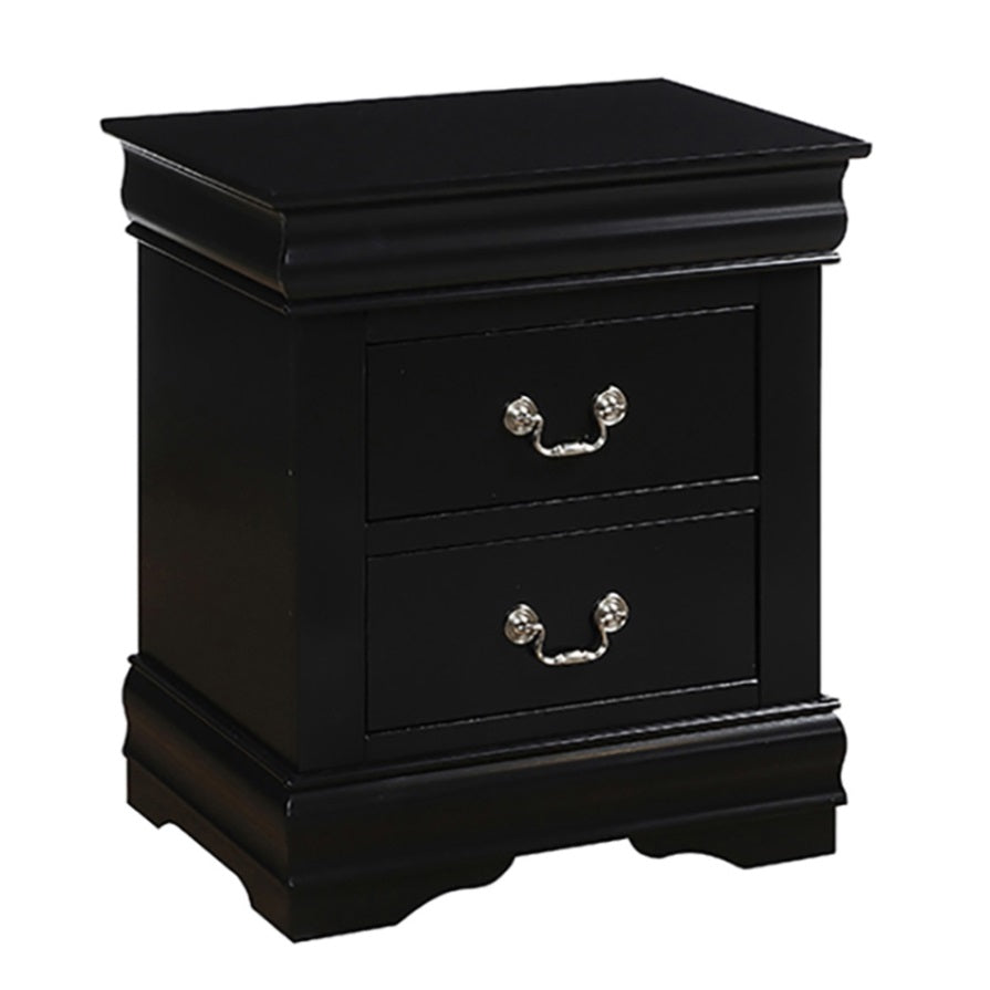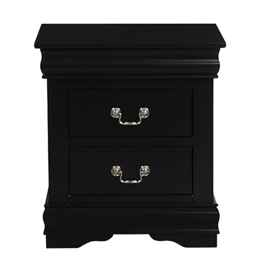 This nightstand offers a timeless and classic design, perfect for traditional bedroom aesthetics, with two drawers providing ample storage space for essentials. Accented with brushed nickel handles that add modern elegance, its compact size makes it ideal for smaller bedrooms or as a complementary piece in the Louis Philippe Collection.