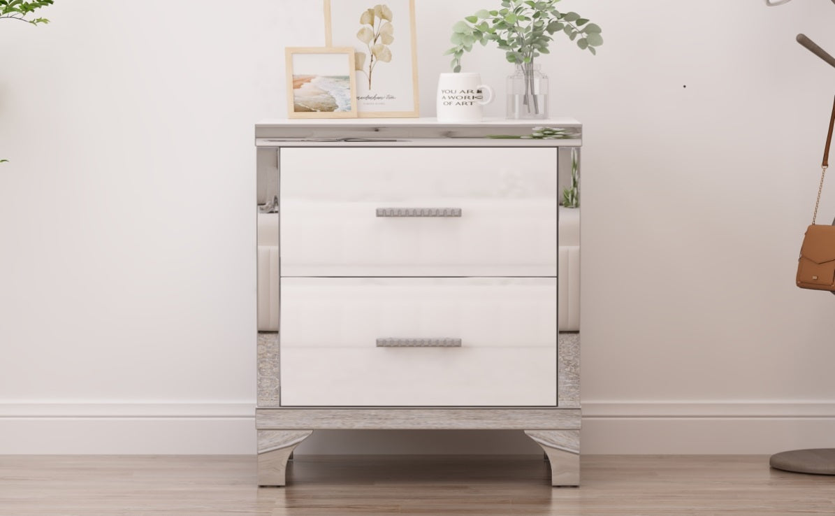 Elegant High Gloss Nightstand with Metal Handle,Mirrored Bedside Table with 2 Drawers for Bedroom