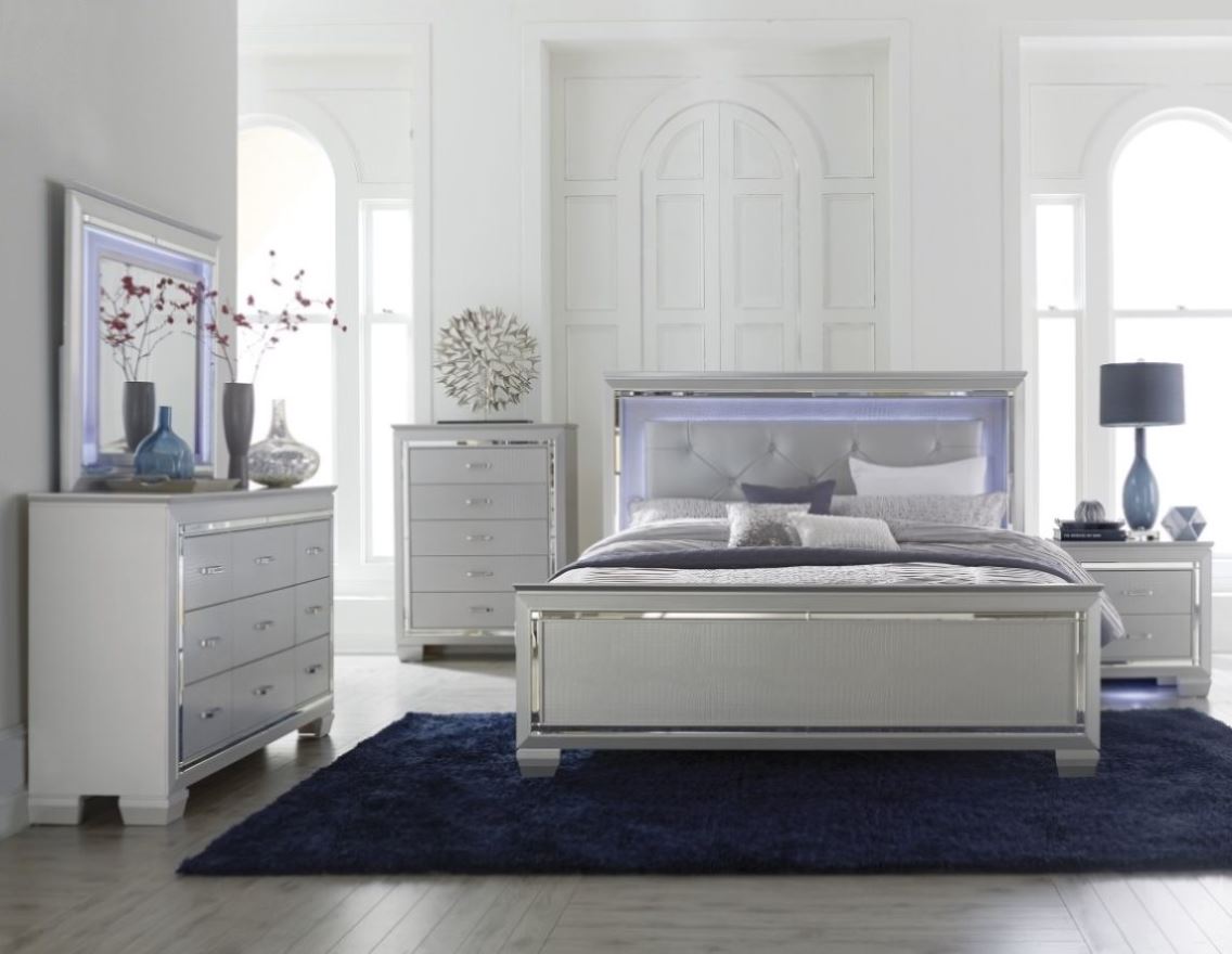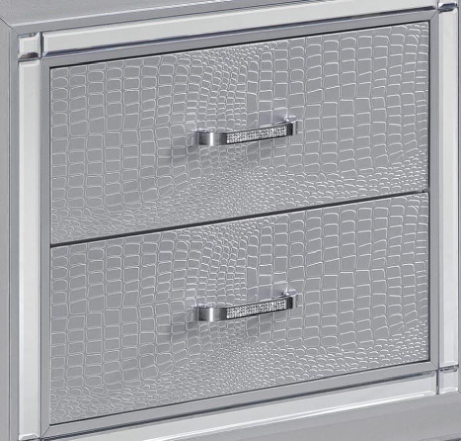 Framing nightstand is a decorative beveled mirror accent that enhances the illumination from the touch-engaged LED under-light of the nightstand. The alligator embossing of the drawer fronts is paired with high-polished crystal-enhanced hardware that boldly decorates the silver finish.