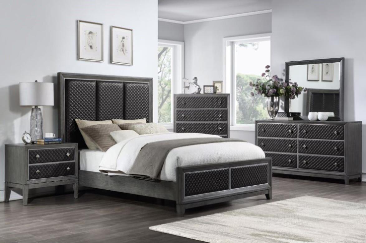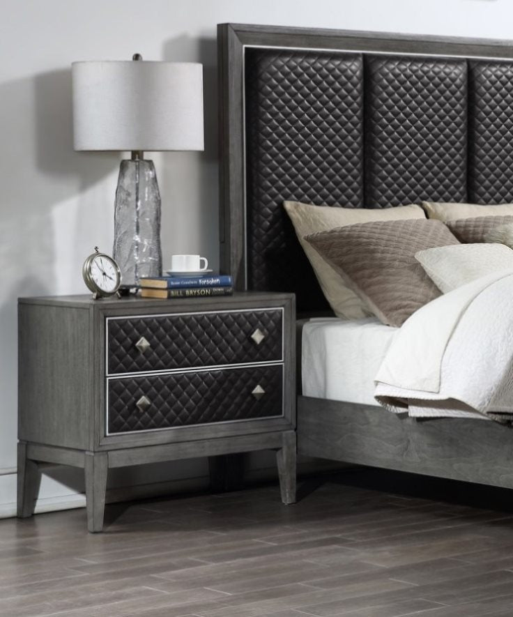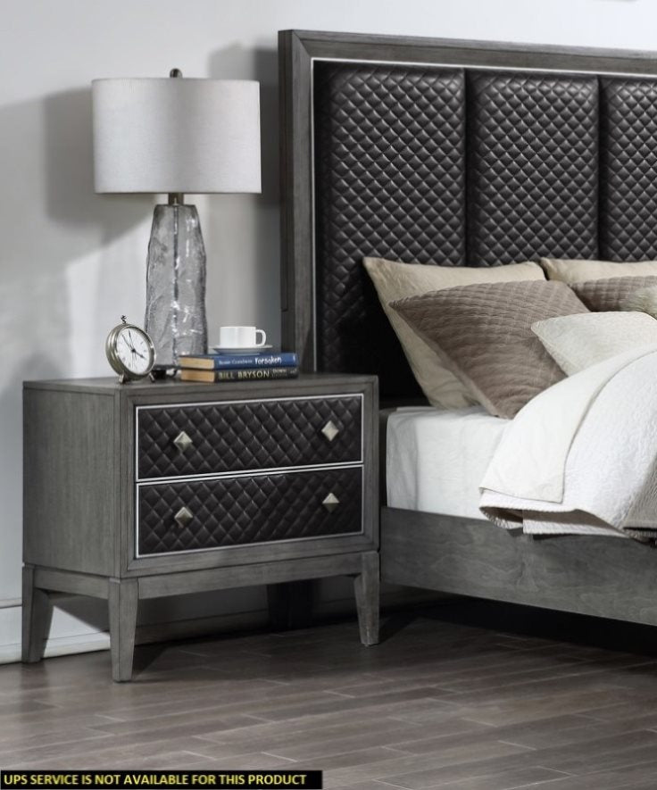 Modern styling is achieved by pairing classic design elements with eye-catching bold lines culminating in the chic look of the West End Collection. Painted silver accent subtly frames the diamond-patterned gray faux leather fronts of the nightstand, each providing complementing contrast to the gray wire-brushed finish of the collection’s birch veneer. Square nickel finished hardware fronts each drawer, furthering the modern look of the West End Collection. PRODUCT DIMENSIONS: Overall Dimension: 29" x 17" x 27"H Drawer interior: 23" X 12.5" X 4.5"H (2) Listing Includes: One Nightstand Only. Simple Assembly Require.