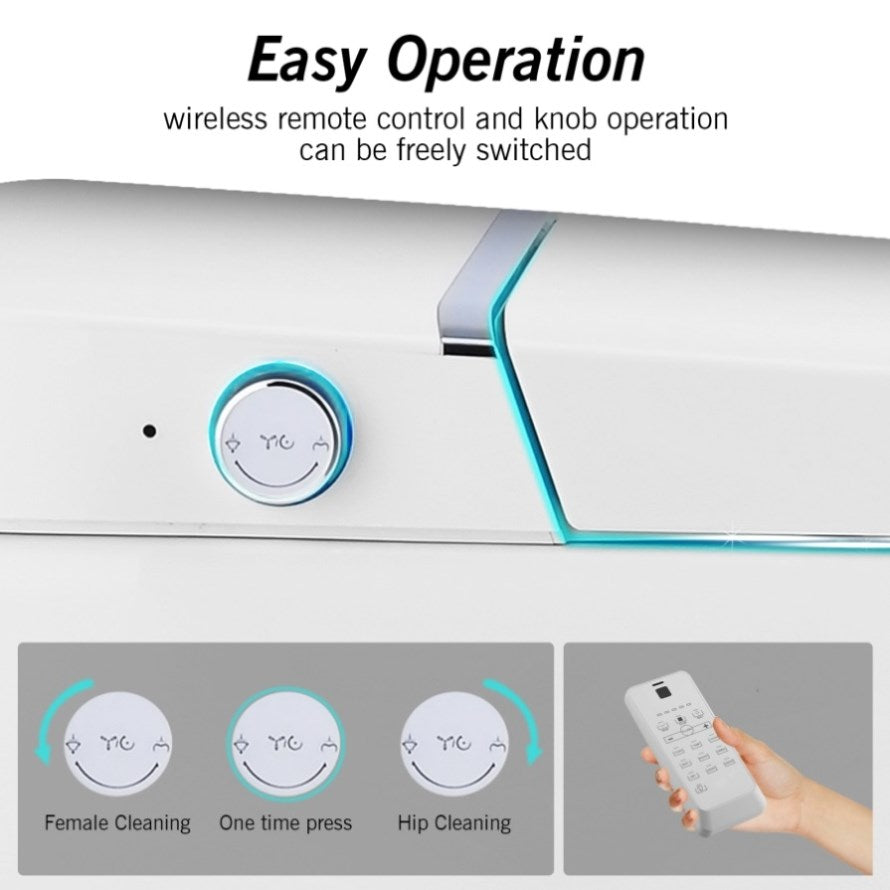 The smart toilet has functions of off-seat flush, foot sensor flush, remote control flush and side knob flush, which completely frees your hands and makes it easy and comfortable.