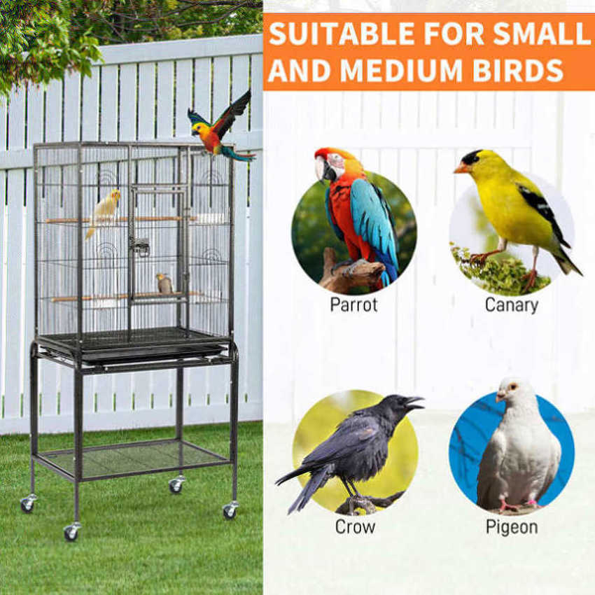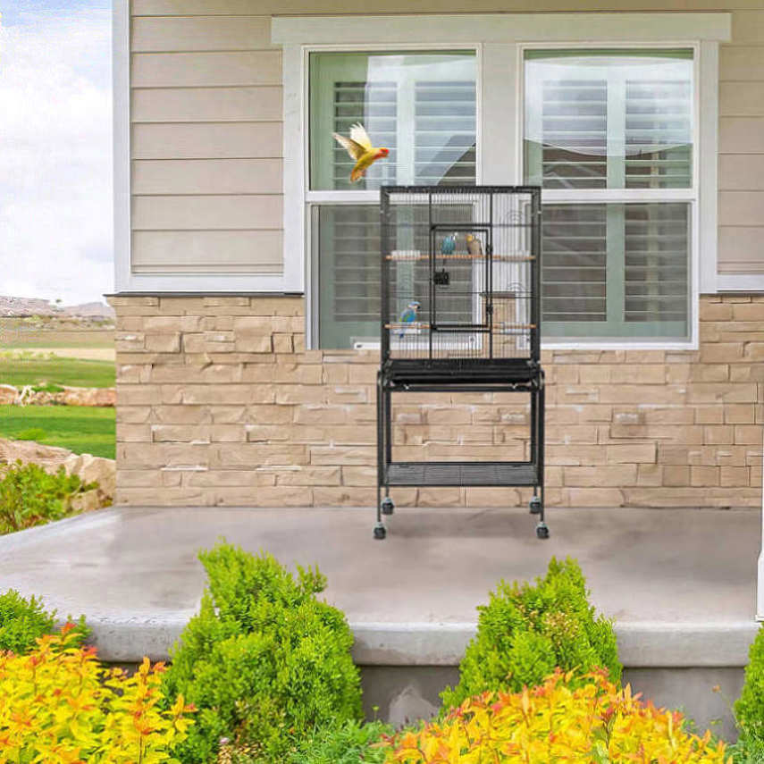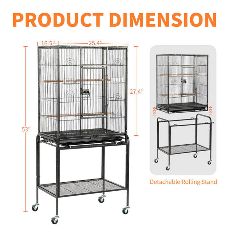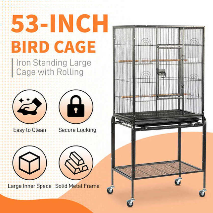 Provide your feathered companions with a spacious and secure haven in this 53" Large Flight Bird Cage. Designed for small to medium birds like parrots, lovebirds, cockatiels, and parakeets, this cage offers ample room for flying, playing, and relaxing. Its robust iron construction ensures long-lasting durability, while thoughtful safety features like tight bar spacing and a secure latch keep your pets protected at all times. Elevated on a smooth-rolling stand with a convenient storage shelf, this birdcage combines functionality and style, making it an ideal choice for any home. With its easy-to-clean slide-out tray and practical design, maintaining a clean and healthy environment for your birds has never been easier. Perfect for pet lovers who want a beautiful, versatile, and hassle-free cage solution!