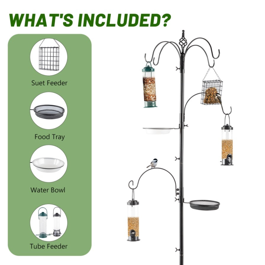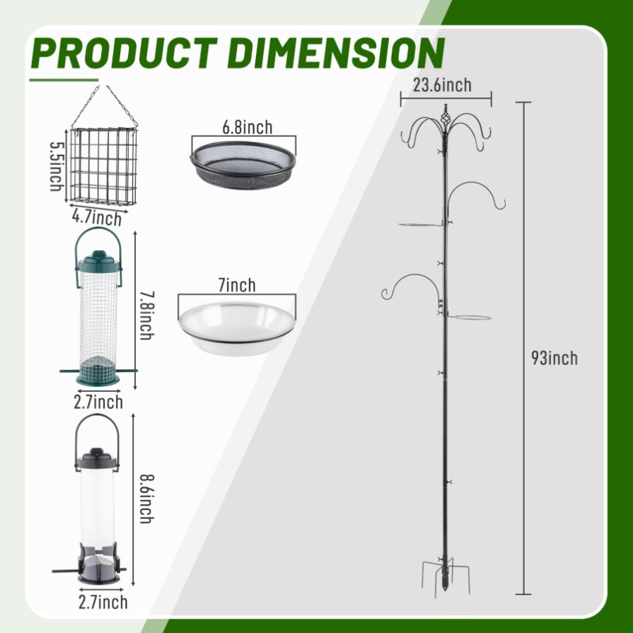 2. Come with a full complement of accessories: 6 hooks, water bowl,  tube feeder, suet feeder , food tray and prongs legs to insert it into the ground for additional stability.