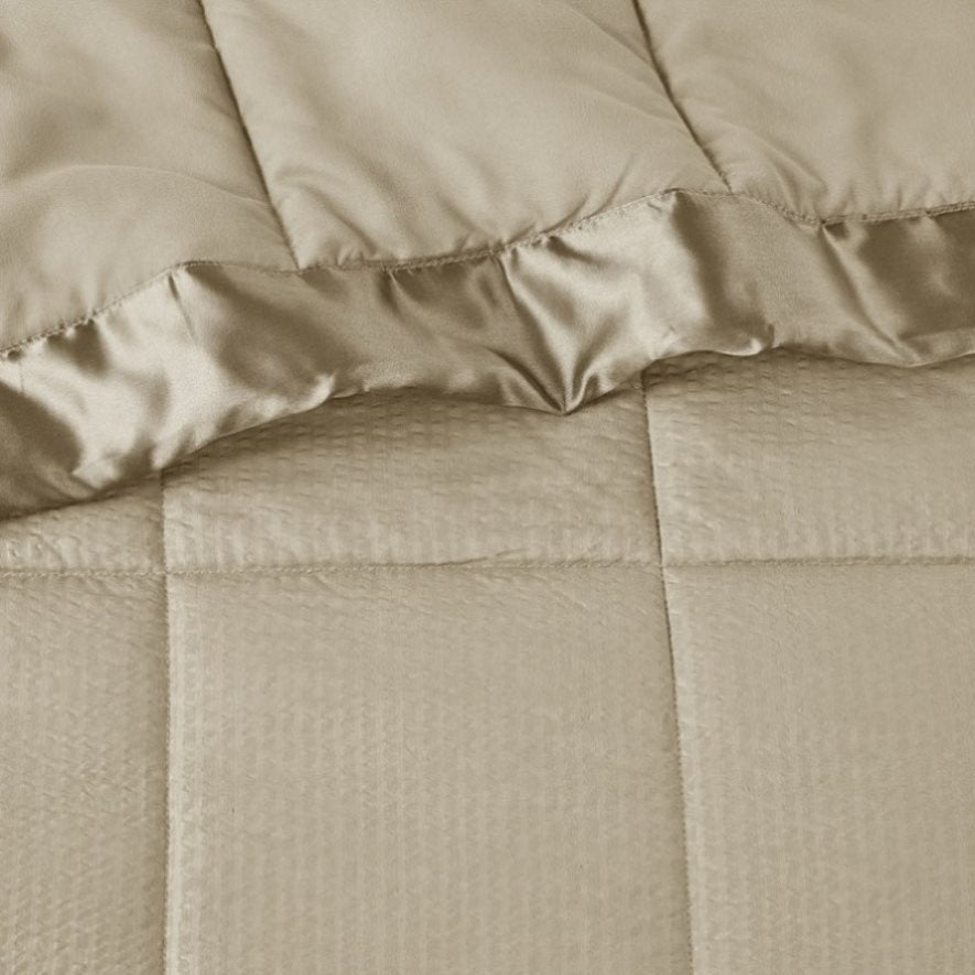 Make every night a cozy one with this textured oversized down alternative blanket. The color-matched 3" satin trim adds a luxury element that feels great on your skin. It features a 3M Scotchgard Moisture Management Treatment that wicks away moisture while helping release stains. Machine washable for easy care with a classic box quilting design. This hypoallergenic blanket is also OEKO-TEX certified, meaning it does not contain any harmful substances or chemicals, ensuring quality comfort and wellness.