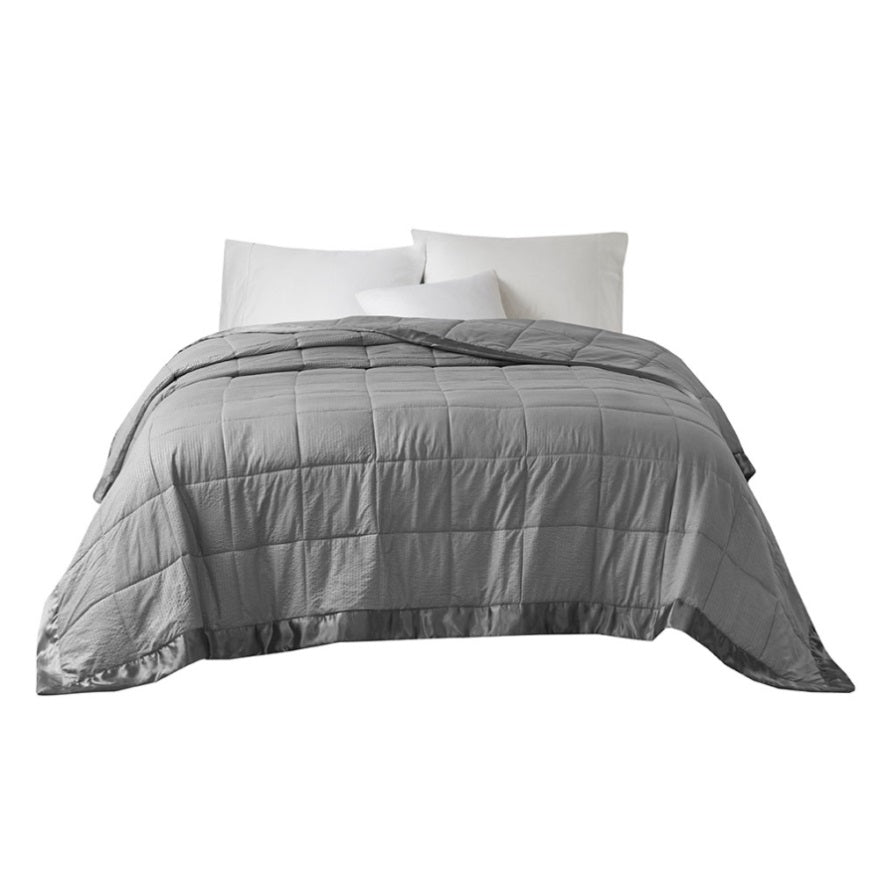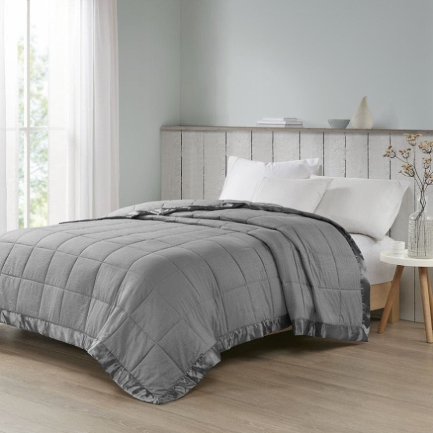 Make every night a cozy one with this textured oversized down alternative blanket. The color-matched 3" satin trim adds a luxury element that feels great on your skin. It features a 3M Scotchgard Moisture Management Treatment that wicks away moisture while helping release stains. Machine washable for easy care with a classic box quilting design. This hypoallergenic blanket is also OEKO-TEX certified, meaning it does not contain any harmful substances or chemicals, ensuring quality comfort and wellness.