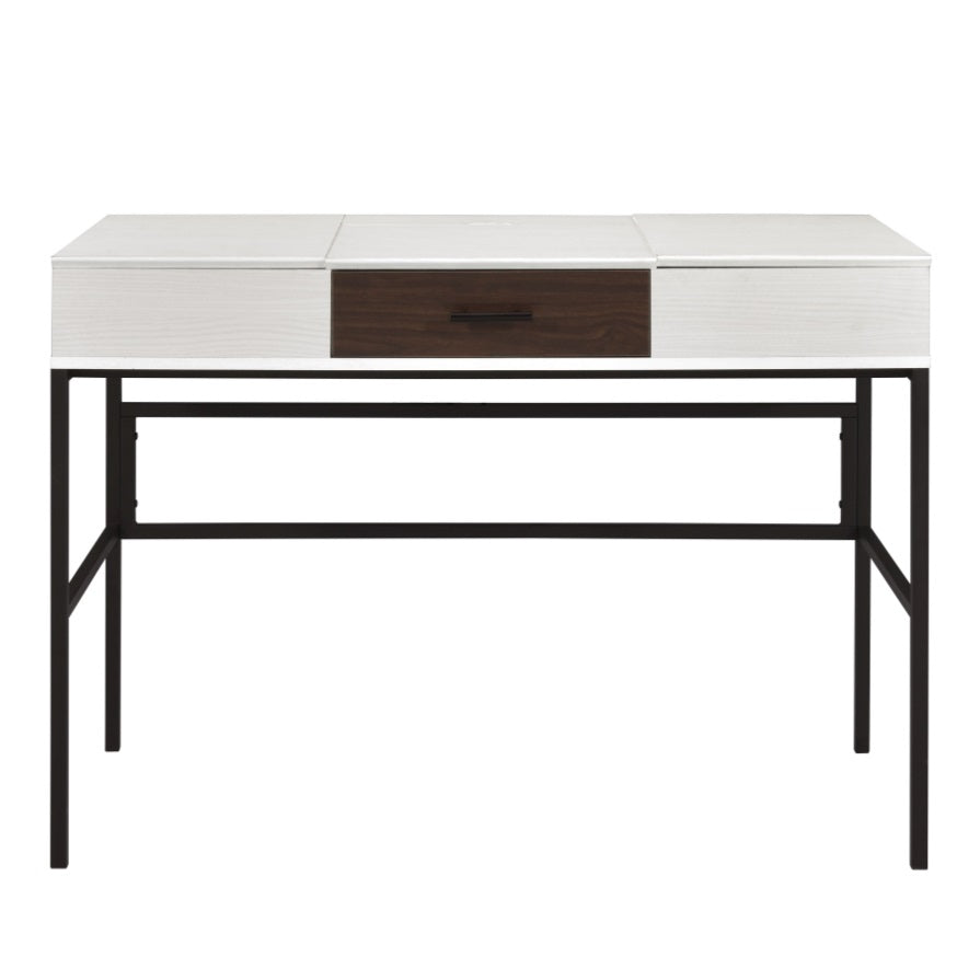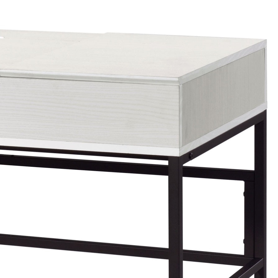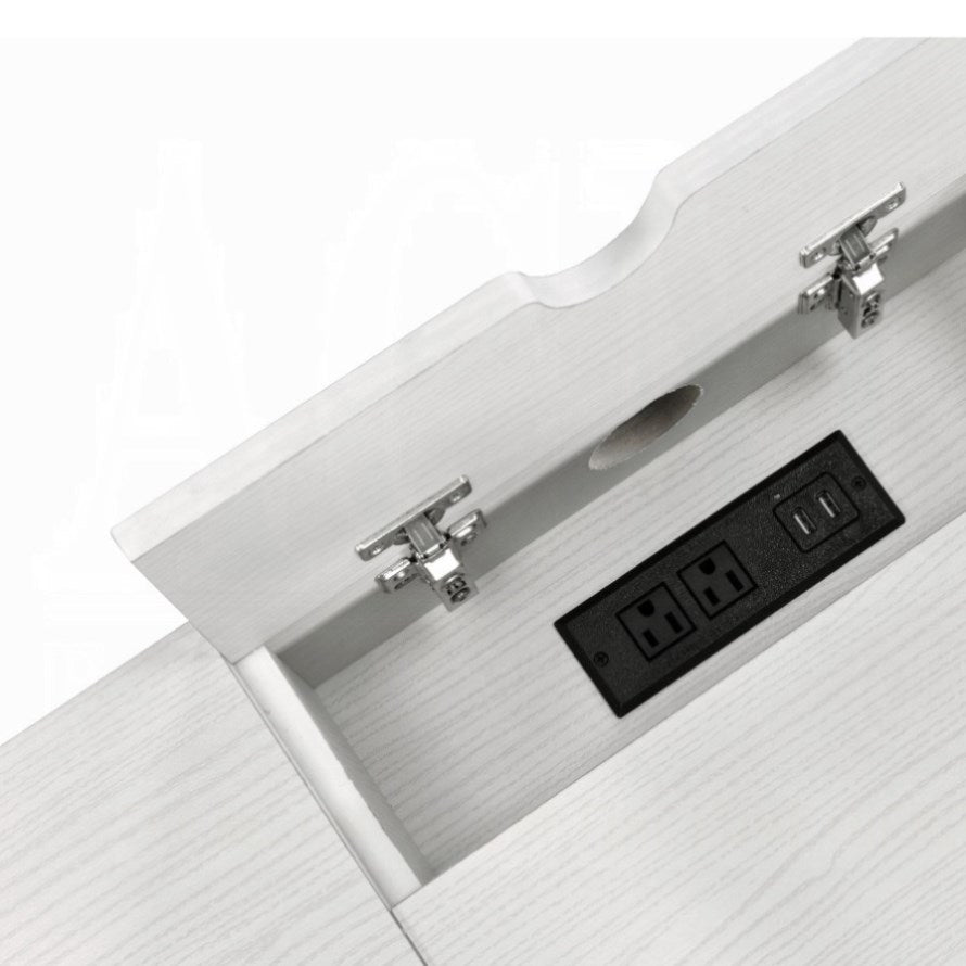 This functional desk includes a built-in USB port and plug, providing convenient charging for electronic devices, while featuring one storage drawer that offers ample space to keep essentials neatly out of sight. The drawer is equipped with a 3/4 extension glide for easy access to contents, utilizing durable side metal drawer glides that enhance functionality with their smooth sliding mechanism.