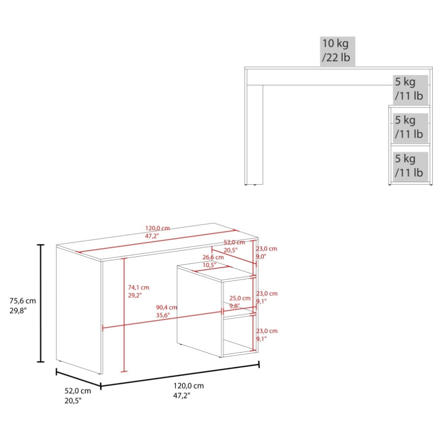"A sleek and functional computer desk made of durable particle board with a melamine finish, designed to optimize space and keep your workspace organized. It features a spacious tabletop perfect for a computer, laptop, or writing, and an integrated side shelving unit with two open compartments for storing books, decorative items, or office essentials. Its minimalist design and compact structure make it ideal for small spaces like home offices or living rooms. Materials: Particle board and melamine. Dimensions: 29,8"" (H) x 47,2"" (W) x 20,5"" (D). "