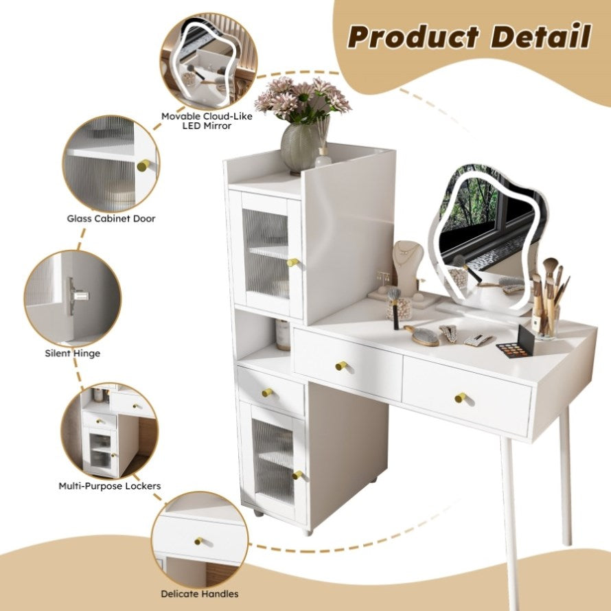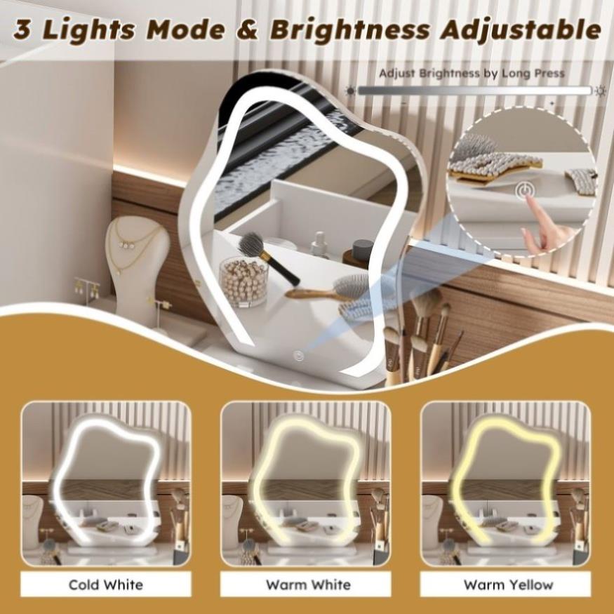 - Vanity mirror with light desk: This vanity desk features a large LED mirror providing clearer lighting during skin care makeup. It has 3 adjustable color modes (warm yellow, warm white, cool white), You can change the color mode by pressing the touch switch