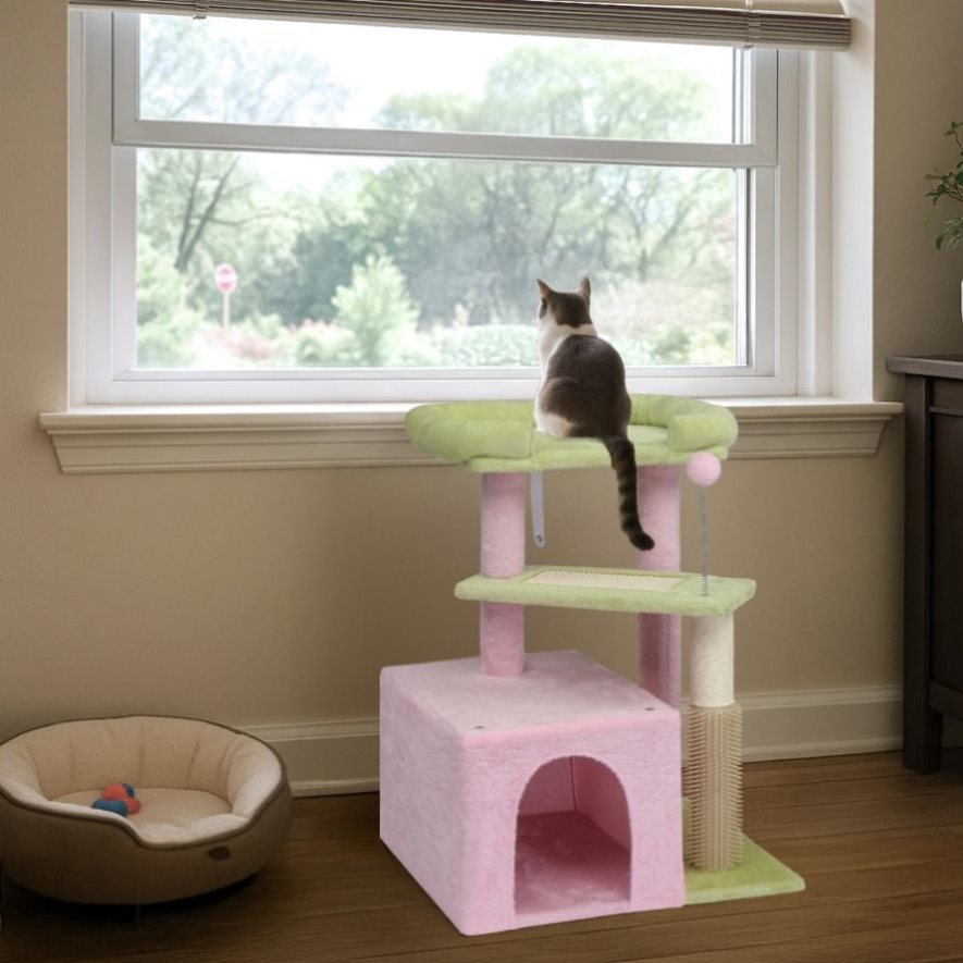 Give your feline friend a cheerful and cozy haven with this multi-level cat tree. Combining comfort and functionality, this cat tower includes a private condo, sisal-covered post and board for scratching, a soft top perch, and a playful hanging toy ball. Perfect for lounging, climbing, scratching, or simply observing from above, it offers a complete activity center in a compact, modern design. Built with sturdy materials and stylish color tones, this cat tree makes a beautiful addition to any indoor space while keeping your cat entertained and relaxed.