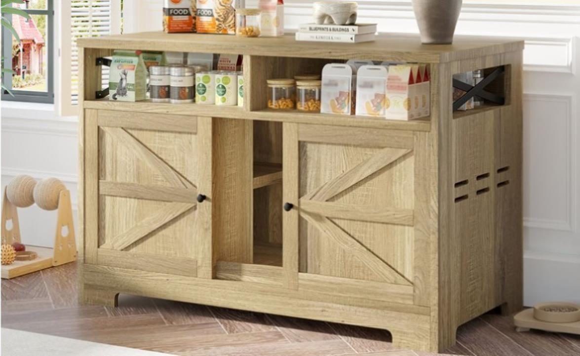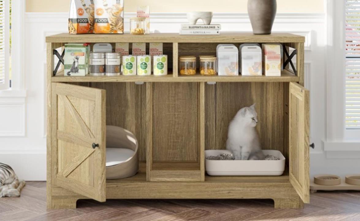 Storage Space: Our versatile litter box enclosure is designed with a spacious countertop and open storage compartments, perfect for storing pet food, toys, and home decor.