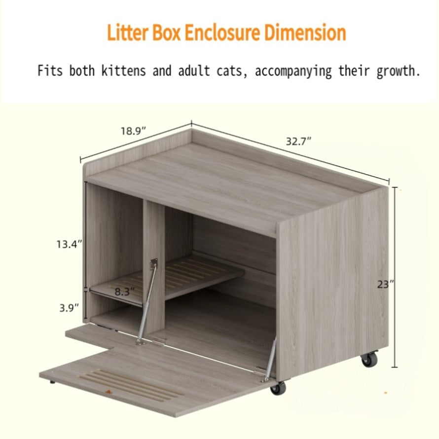 2.The exclusive design: The bottom is equipped with silent wheels, which can be easily pushed and pulled to any corner. No need to carry it laboriously, suitable for your home layout and cleaning needs.The cat door can be opened and closed to increase the privacy of the cat. Close the door to block cat litter, and open the door to facilitate cleaning of the litter box enclosure.