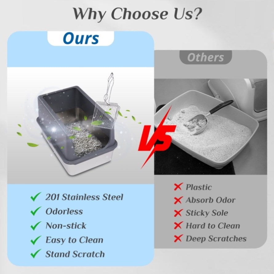 2. Effortless Cleaning: Say goodbye to stubborn stains and lingering odors. The smooth stainless steel surface ensures that litter residue and smells are wiped away with minimal effort. What's more, the stainless steel material does not absorb odors or retain stains, making maintenance incredibly simple and keeping your cat's space fresh and hygienic.