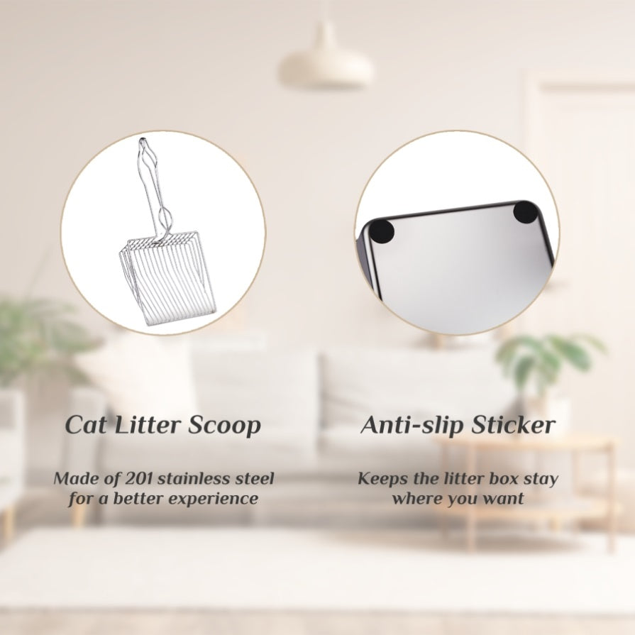 5. Thoughtful Extras for a Cleaner Home: The silent non-slip pads on the base prevent sliding and reduce noise, protecting your floors while keeping the litter box steady. The stainless steel litter scoop is designed for efficient scooping. Additionally, the double-layer litter mat is perfect for trapping stray litter, keeping your floors cleaner and your home more organized.