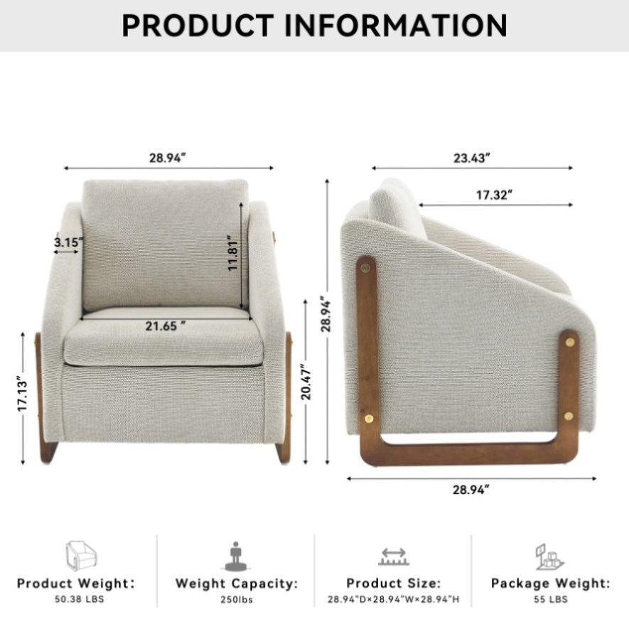 Product Dimensions:28.94" D × 28.94" W × 28.94" H,Weight:50.38 LBS.Package Size&Package Weight:29.72“ × 25.59” × 11.81'' ,Weight:55 LBS.Product Composition:Chenille Material+Foam Filling+Wooden Frame+Wooden Side Frame with golden naihead trim+Floor Protection and Isolation Foot Nail.Ergonomic Backrest,Product Capacity:250 LBS.Use Case:Indoor, Living Room,Bedroom and Other indoor space.Product Assembly:one person can assemble it in 30...
