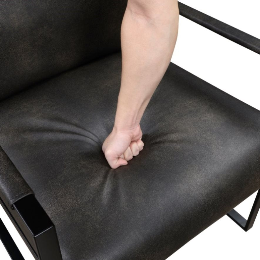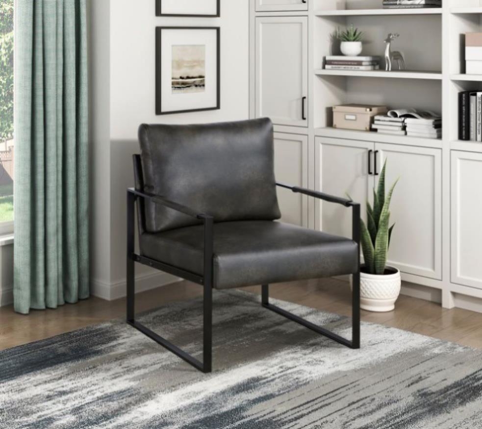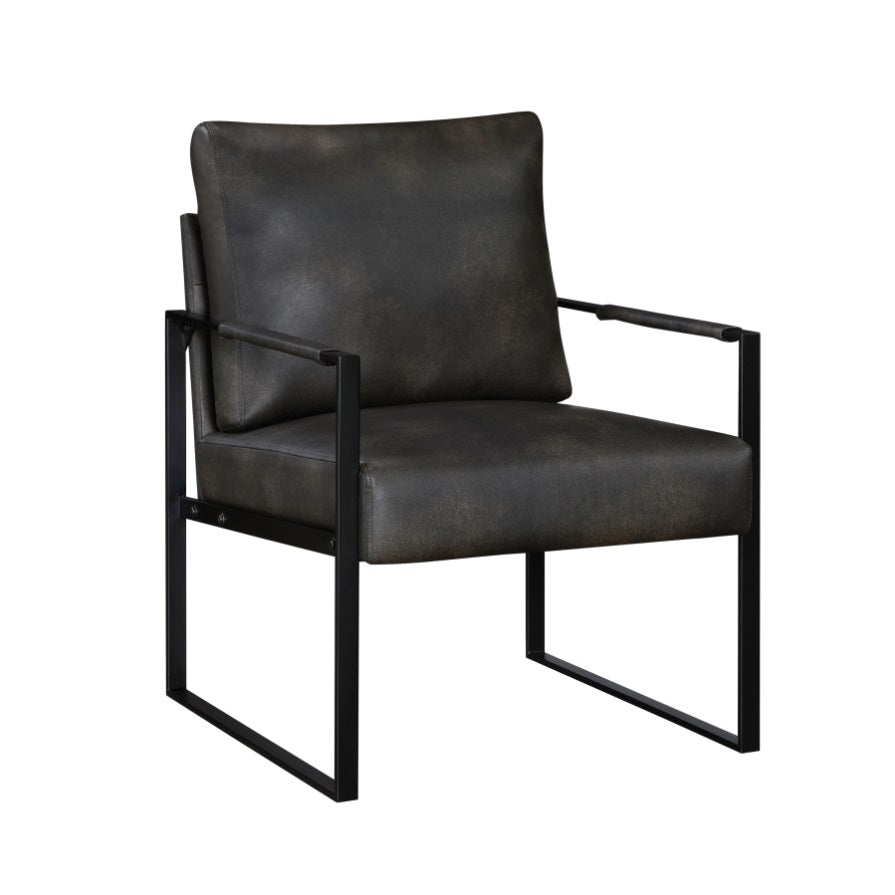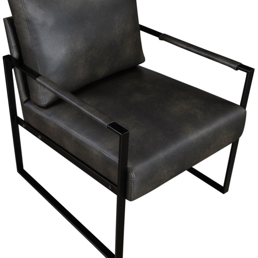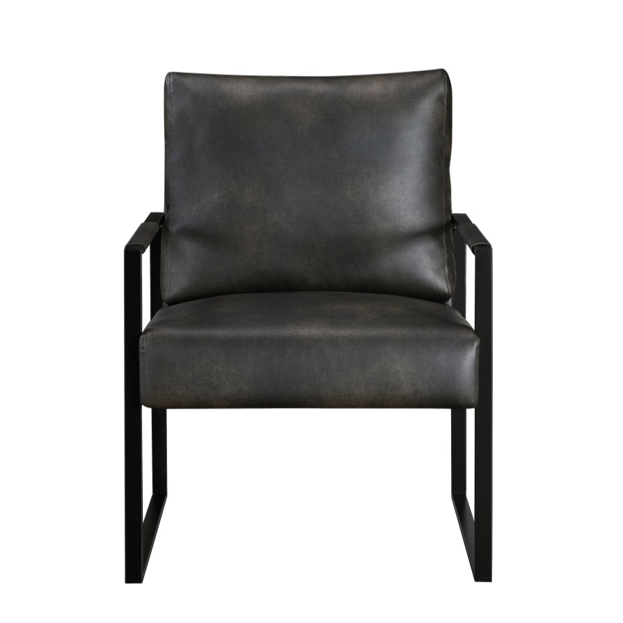 Exposed metal frame in black finishFoam cushioned seatDark gray faux leather upholsteryLoose back and attached seat cushionsUpholstery-wrapped armrestsWeight capacity: 300lbs Description & Dimensions Add a touch of modern sophistication to your space with this stylish metal accent chair upholstered in sleek dark gray faux leather. Designed for both comfort and...