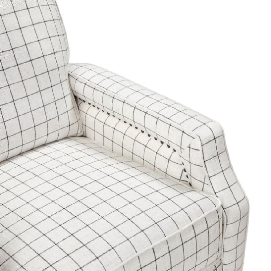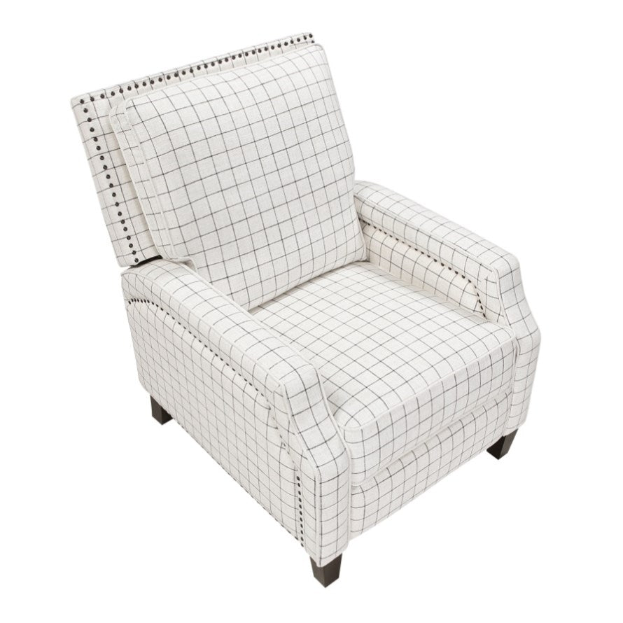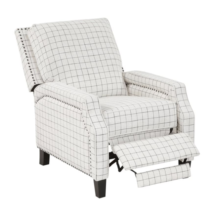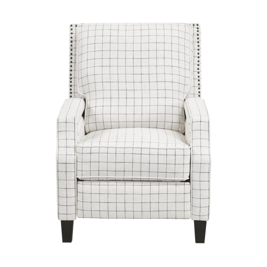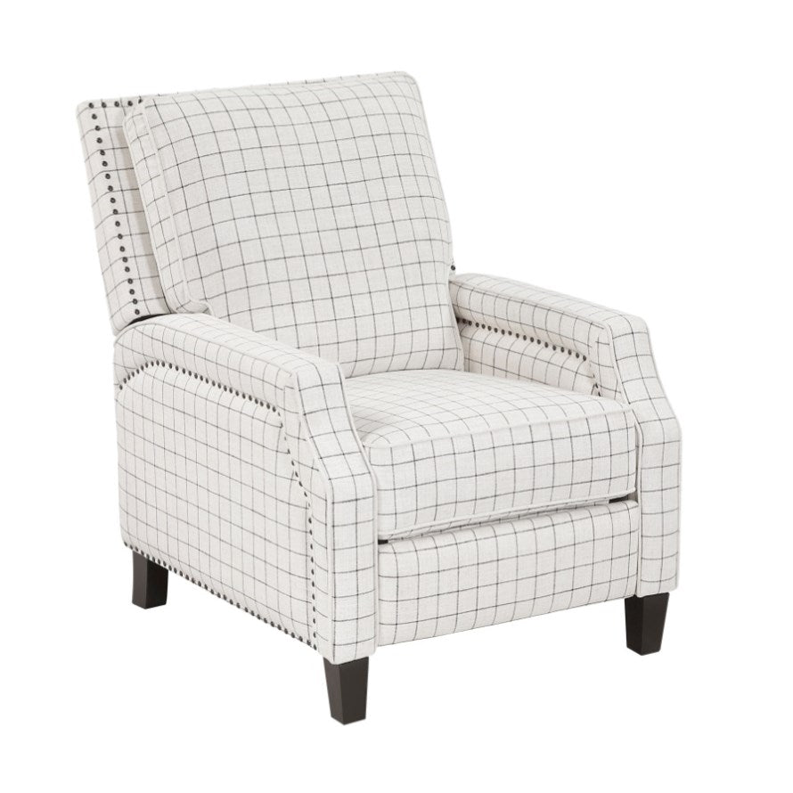 Solid wood and plywood frame with metal reinforced seatFoam padding over pocket coilsTextured fabric upholsteryAttached back and seat cushionsExposed wood feet with black finishPush-back/self-reclining motionNailhead trimRemovable seat backWeight capacity: 300lbsFabric Color: Off-white with black plaid pattern Description & Dimensions Indulge in ultimate relaxation with the push-back recliner. Designed for both...