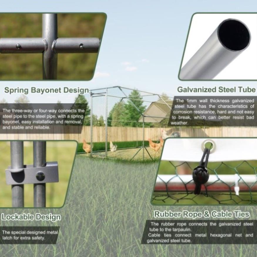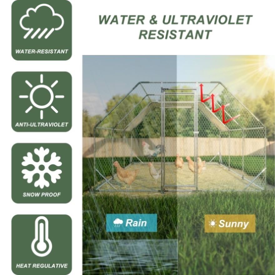 Featuring galvanized coop, robust steel tubes with eco-friendly power coating finishing, guaranteed to last for years. The coating is protective and resists rust, corrosion, and fading so that the coop is weatherproof and of great durability.A durable UV and water-resistant tarp can protect your chicken from the weather and outside...