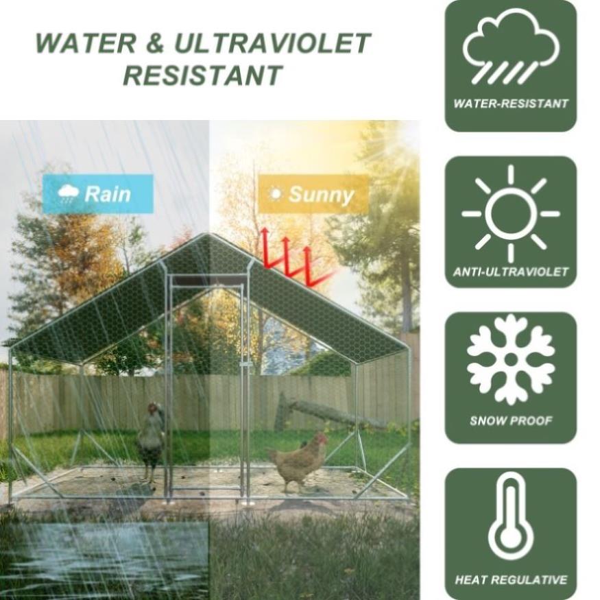 Durable Construction:Made of a strong steel frame and thick PVC coated wire mesh, our large metal chicken coop is solid enough to withstand long-term outdoor use and keep the chicken safe from predators. Besides, the frame and wire mesh can protect the hen run house from rust and wear, which in return, will provide the animals and owner with a clean living environment.