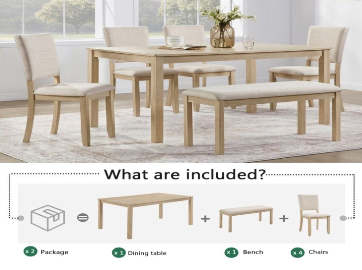 Place of Origin:Viet Nam Main Color:Beige,Light Oak Main Material:Bent Wood,Fabric,MDF,Rubber Wood Filler:Foam Use Case:Dining Room Seating Capacity:Seats 6 Table Shape:Rectangular Chair Material:Upholstered Chair Table Frame Material:Wood Table Base Types:4 Leg Dining Set Configuration:Dining Table with Chair and Bench ย Product Dimensions Assembled Length (in.):58.50 Assembled Width (in.):34.50 Assembled Height (in.):30.00...
